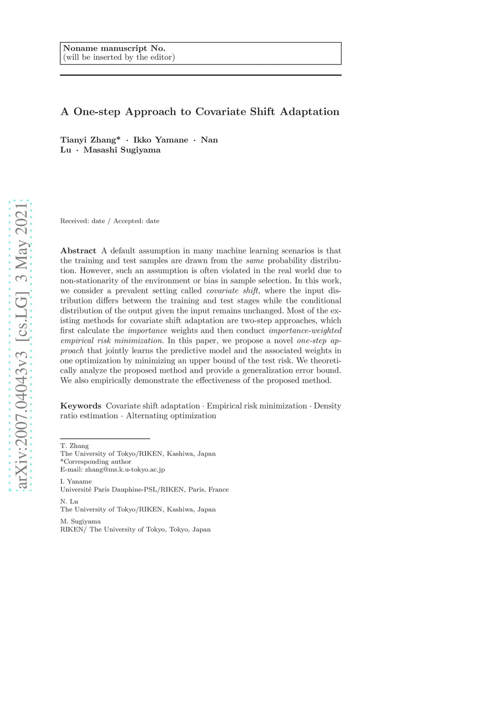 A default assumption in many machine learning scenarios is that the training and test samples are drawn from the same probability distribution. However, such an assumption is often violated in the real world due to non-stationarity of the environment or bias in sample selection. In this work, we consider a prevalent setting called covariate shift, where the input distribution differs between the training and test stages while the conditional distribution of the output given the input remains unchanged. Most of the existing methods for covariate shift adaptation are two-step approaches, which first calculate the importance weights and then conduct importance-weighted empirical risk minimization. In this paper, we propose a novel one-step approach that jointly learns the predictive model and the associated weights in one optimization by minimizing an upper bound of the test risk. We theoretically analyze the proposed method and provide a generalization error bound. We also empirically demonstrate the effectiveness of the proposed method.