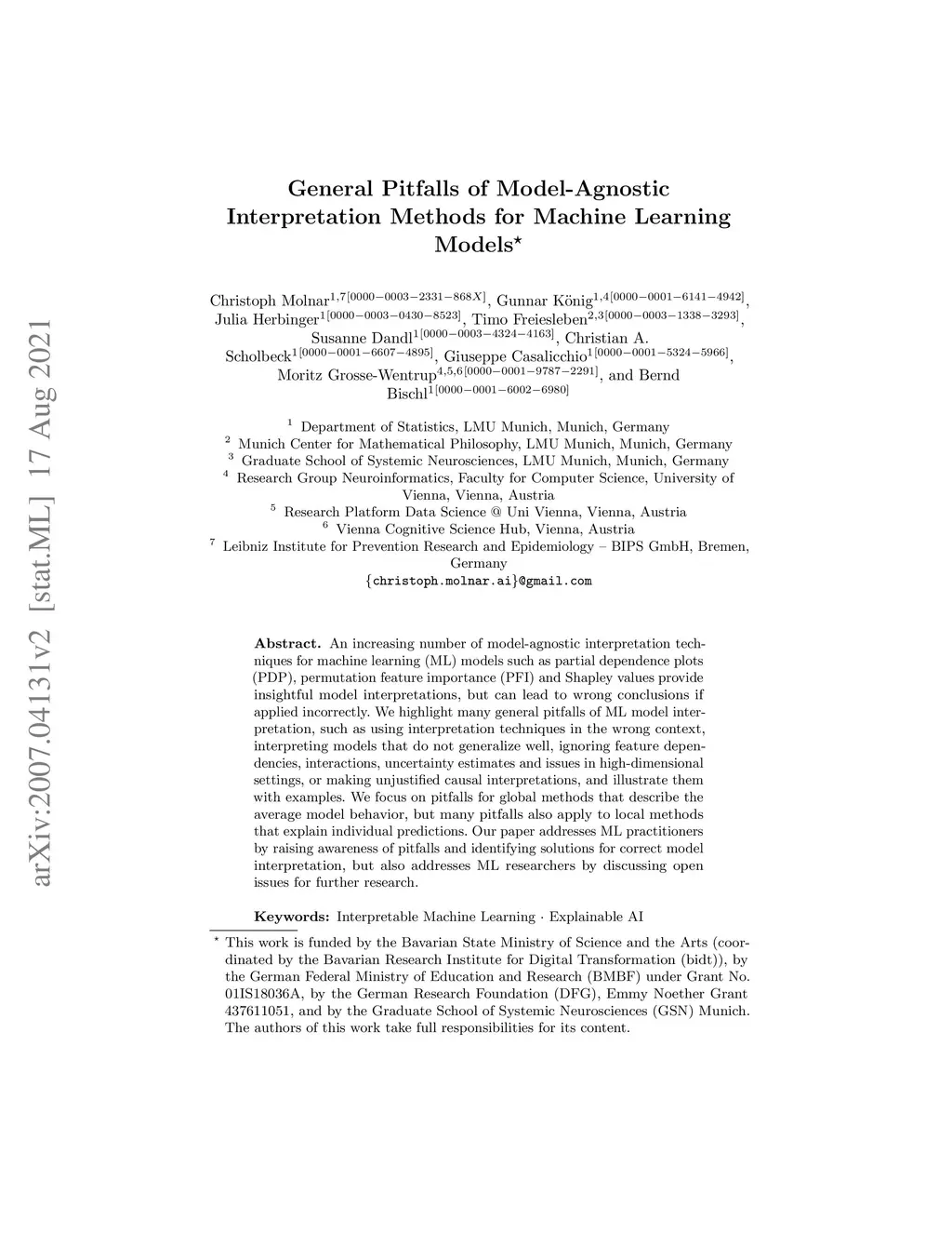 An increasing number of model-agnostic interpretation techniques for machine learning (ML) models such as partial dependence plots (PDP), permutation feature importance (PFI) and Shapley values provide insightful model interpretations, but can lead to wrong conclusions if applied incorrectly. We highlight many general pitfalls of ML model interpretation, such as using interpretation techniques in the wrong context, interpreting models that do not generalize well, ignoring feature dependencies, interactions, uncertainty estimates and issues in high-dimensional settings, or making unjustified causal interpretations, and illustrate them with examples. We focus on pitfalls for global methods that describe the average model behavior, but many pitfalls also apply to local methods that explain individual predictions. Our paper addresses ML practitioners by raising awareness of pitfalls and identifying solutions for correct model interpretation, but also addresses ML researchers by discussing open issues for further research.