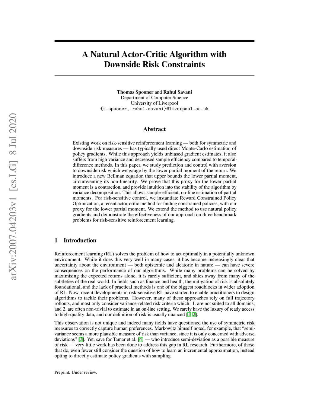 Existing work on risk-sensitive reinforcement learning - both for symmetric and downside risk measures - has typically used direct Monte-Carlo estimation of policy gradients. While this approach yields unbiased gradient estimates, it also suffers from high variance and decreased sample efficiency compared to temporal-difference methods. In this paper, we study prediction and control with aversion to downside risk which we gauge by the lower partial moment of the return. We introduce a new Bellman equation that upper bounds the lower partial moment, circumventing its non-linearity. We prove that this proxy for the lower partial moment is a contraction, and provide intuition into the stability of the algorithm by variance decomposition. This allows sample-efficient, on-line estimation of partial moments. For risk-sensitive control, we instantiate Reward Constrained Policy Optimization, a recent actor-critic method for finding constrained policies, with our proxy for the lower partial moment. We extend the method to use natural policy gradients and demonstrate the effectiveness of our approach on three benchmark problems for risk-sensitive reinforcement learning.