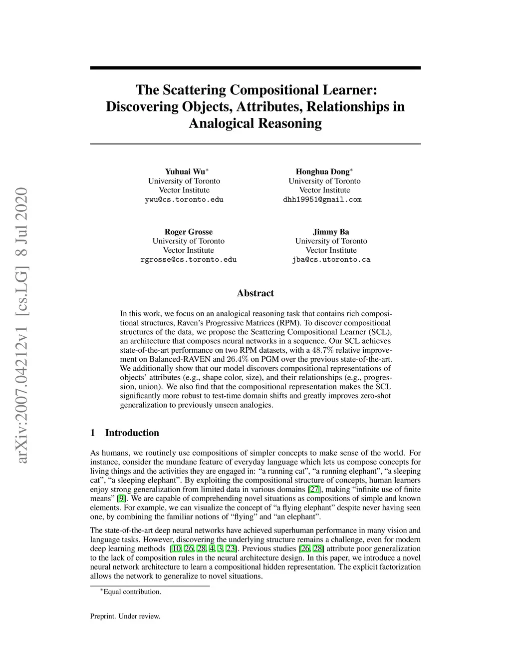 In this work, we focus on an analogical reasoning task that contains rich compositional structures, Raven's Progressive Matrices (RPM). To discover compositional structures of the data, we propose the Scattering Compositional Learner (SCL), an architecture that composes neural networks in a sequence. Our SCL achieves state-of-the-art performance on two RPM datasets, with a 48.7% relative improvement on Balanced-RAVEN and 26.4% on PGM over the previous state-of-the-art. We additionally show that our model discovers compositional representations of objects' attributes (e.g., shape color, size), and their relationships (e.g., progression, union). We also find that the compositional representation makes the SCL significantly more robust to test-time domain shifts and greatly improves zero-shot generalization to previously unseen analogies.
