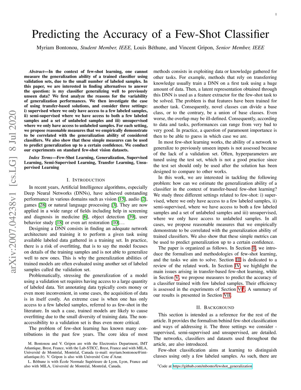 In the context of few-shot learning, one cannot measure the generalization ability of a trained classifier using validation sets, due to the small number of labeled samples. In this paper, we are interested in finding alternatives to answer the question: is my classifier generalizing well to previously unseen data? We first analyze the reasons for the variability of generalization performances. We then investigate the case of using transfer-based solutions, and consider three settings: i) supervised where we only have access to a few labeled samples, ii) semi-supervised where we have access to both a few labeled samples and a set of unlabeled samples and iii) unsupervised where we only have access to unlabeled samples. For each setting, we propose reasonable measures that we empirically demonstrate to be correlated with the generalization ability of considered classifiers. We also show that these simple measures can be used to predict generalization up to a certain confidence. We conduct our experiments on standard few-shot vision datasets.