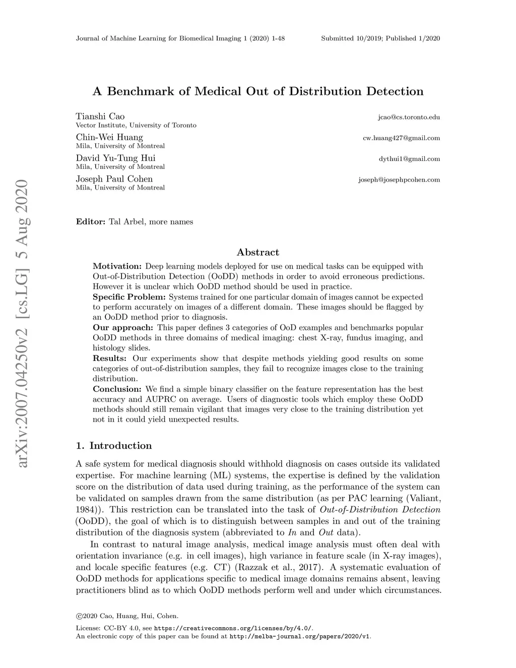 Motivation: Deep learning models deployed for use on medical tasks can be equipped with Out-of-Distribution Detection (OoDD) methods in order to avoid erroneous predictions. However it is unclear which OoDD method should be used in practice. Specific Problem: Systems trained for one particular domain of images cannot be expected to perform accurately on images of a different domain. These images should be flagged by an OoDD method prior to diagnosis. Our approach: This paper defines 3 categories of OoD examples and benchmarks popular OoDD methods in three domains of medical imaging: chest X-ray, fundus imaging, and histology slides. Results: Our experiments show that despite methods yielding good results on some categories of out-of-distribution samples, they fail to recognize images close to the training distribution. Conclusion: We find a simple binary classifier on the feature representation has the best accuracy and AUPRC on average. Users of diagnostic tools which employ these OoDD methods should still remain vigilant that images very close to the training distribution yet not in it could yield unexpected results.