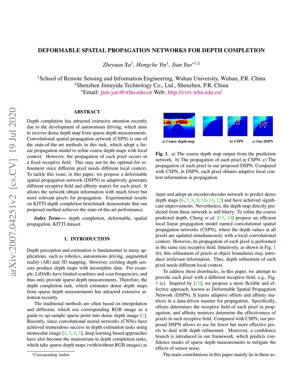 Depth completion has attracted extensive attention recently due to the development of autonomous driving, which aims to recover dense depth map from sparse depth measurements. Convolutional spatial propagation network (CSPN) is one of the state-of-the-art methods in this task, which adopt a linear propagation model to refine coarse depth maps with local context. However, the propagation of each pixel occurs in a fixed receptive field. This may not be the optimal for refinement since different pixel needs different local context. To tackle this issue, in this paper, we propose a deformable spatial propagation network (DSPN) to adaptively generates different receptive field and affinity matrix for each pixel. It allows the network obtain information with much fewer but more relevant pixels for propagation. Experimental results on KITTI depth completion benchmark demonstrate that our proposed method achieves the state-of-the-art performance.