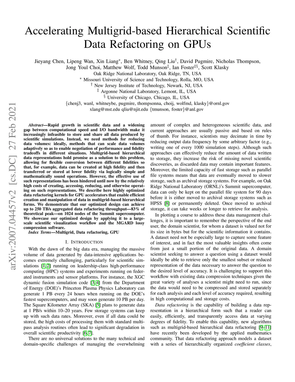 Rapid growth in scientific data and a widening gap between computational speed and I/O bandwidth make it increasingly infeasible to store and share all data produced by scientific simulations. Instead, we need methods for reducing data volumes: ideally, methods that can scale data volumes adaptively so as to enable negotiation of performance and fidelity tradeoffs in different situations. Multigrid-based hierarchical data representations hold promise as a solution to this problem, allowing for flexible conversion between different fidelities so that, for example, data can be created at high fidelity and then transferred or stored at lower fidelity via logically simple and mathematically sound operations. However, the effective use of such representations has been hindered until now by the relatively high costs of creating, accessing, reducing, and otherwise operating on such representations. We describe here highly optimized data refactoring kernels for GPU accelerators that enable efficient creation and manipulation of data in multigrid-based hierarchical forms. We demonstrate that our optimized design can achieve up to 250 TB/s aggregated data refactoring throughput -- 83% of theoretical peak -- on 1024 nodes of the Summit supercomputer. We showcase our optimized design by applying it to a large-scale scientific visualization workflow and the MGARD lossy compression software.
