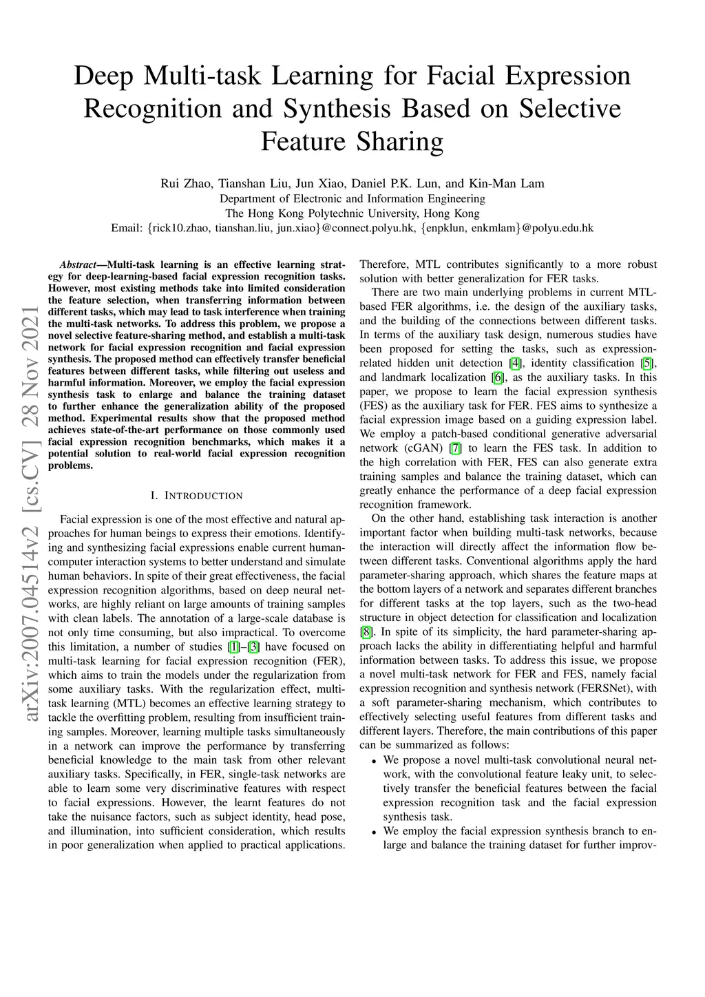 Multi-task learning is an effective learning strategy for deep-learning-based facial expression recognition tasks. However, most existing methods take into limited consideration the feature selection, when transferring information between different tasks, which may lead to task interference when training the multi-task networks. To address this problem, we propose a novel selective feature-sharing method, and establish a multi-task network for facial expression recognition and facial expression synthesis. The proposed method can effectively transfer beneficial features between different tasks, while filtering out useless and harmful information. Moreover, we employ the facial expression synthesis task to enlarge and balance the training dataset to further enhance the generalization ability of the proposed method. Experimental results show that the proposed method achieves state-of-the-art performance on those commonly used facial expression recognition benchmarks, which makes it a potential solution to real-world facial expression recognition problems.