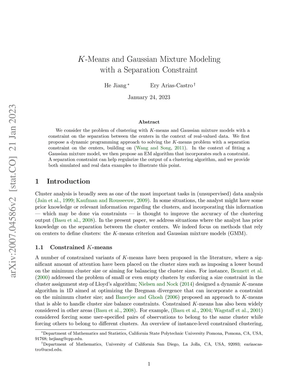 We consider the problem of clustering with -means and Gaussian mixture models with a constraint on the separation between the centers in the context of real-valued data. We first propose a dynamic programming approach to solving the -means problem with a separation constraint on the centers, building on (Wang and Song, 2011). In the context of fitting a Gaussian mixture model, we then propose an EM algorithm that incorporates such a constraint. A separation constraint can help regularize the output of a clustering algorithm, and we provide both simulated and real data examples to illustrate this point.