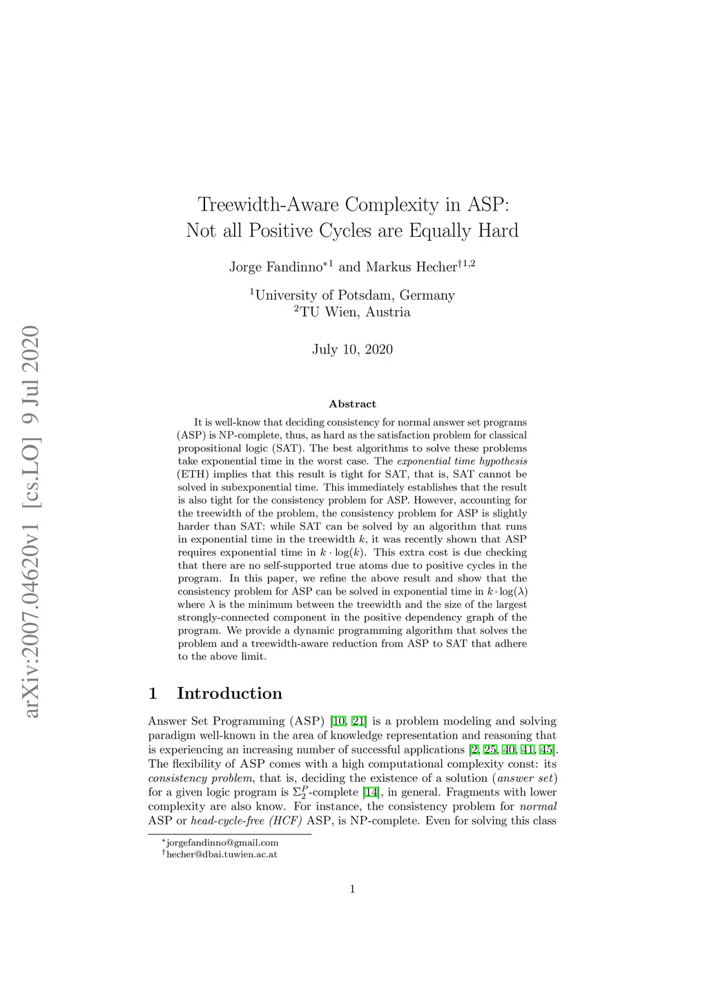 It is well-know that deciding consistency for normal answer set programs (ASP) is NP-complete, thus, as hard as the satisfaction problem for classical propositional logic (SAT). The best algorithms to solve these problems take exponential time in the worst case. The exponential time hypothesis (ETH) implies that this result is tight for SAT, that is, SAT cannot be solved in subexponential time. This immediately establishes that the result is also tight for the consistency problem for ASP. However, accounting for the treewidth of the problem, the consistency problem for ASP is slightly harder than SAT: while SAT can be solved by an algorithm that runs in exponential time in the treewidth k, it was recently shown that ASP requires exponential time in k \cdot log(k). This extra cost is due checking that there are no self-supported true atoms due to positive cycles in the program. In this paper, we refine the above result and show that the consistency problem for ASP can be solved in exponential time in k \cdot log({\lambda}) where {\lambda} is the minimum between the treewidth and the size of the largest strongly-connected component in the positive dependency graph of the program. We provide a dynamic programming algorithm that solves the problem and a treewidth-aware reduction from ASP to SAT that adhere to the above limit.