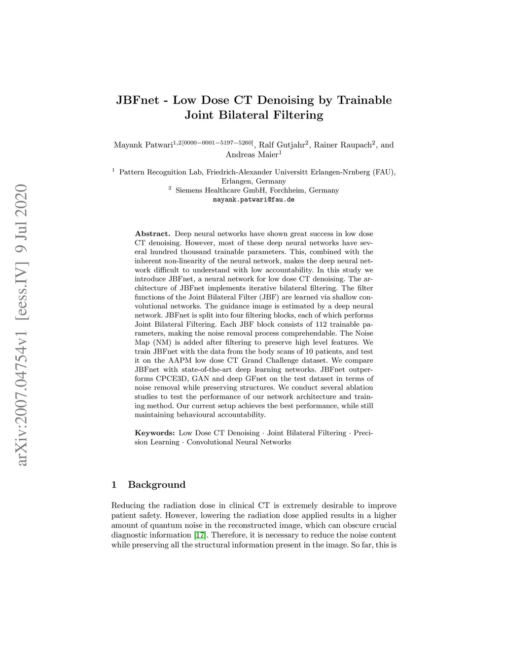 JBFnet -- Low Dose CT Denoising by Trainable Joint Bilateral Filtering