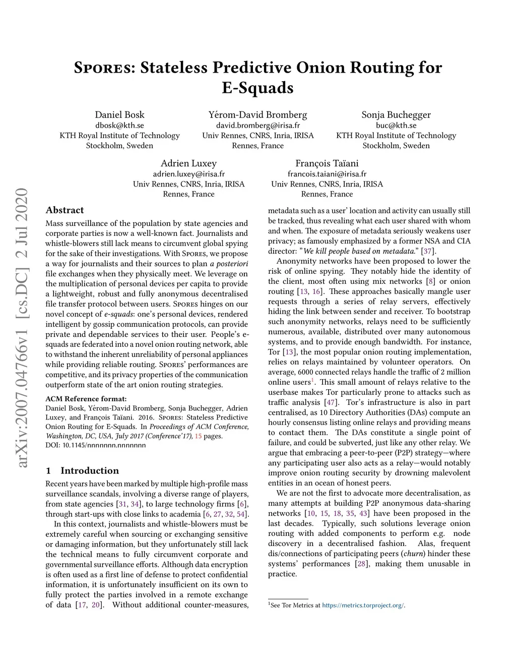 Spores: Stateless Predictive Onion Routing for E-Squads