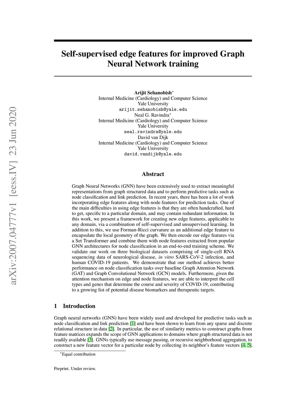 Graph Neural Networks (GNN) have been extensively used to extract meaningful representations from graph structured data and to perform predictive tasks such as node classification and link prediction. In recent years, there has been a lot of work incorporating edge features along with node features for prediction tasks. One of the main difficulties in using edge features is that they are often handcrafted, hard to get, specific to a particular domain, and may contain redundant information. In this work, we present a framework for creating new edge features, applicable to any domain, via a combination of self-supervised and unsupervised learning. In addition to this, we use Forman-Ricci curvature as an additional edge feature to encapsulate the local geometry of the graph. We then encode our edge features via a Set Transformer and combine them with node features extracted from popular GNN architectures for node classification in an end-to-end training scheme. We validate our work on three biological datasets comprising of single-cell RNA sequencing data of neurological disease, \textit{in vitro} SARS-CoV-2 infection, and human COVID-19 patients. We demonstrate that our method achieves better performance on node classification tasks over baseline Graph Attention Network (GAT) and Graph Convolutional Network (GCN) models. Furthermore, given the attention mechanism on edge and node features, we are able to interpret the cell types and genes that determine the course and severity of COVID-19, contributing to a growing list of potential disease biomarkers and therapeutic targets.