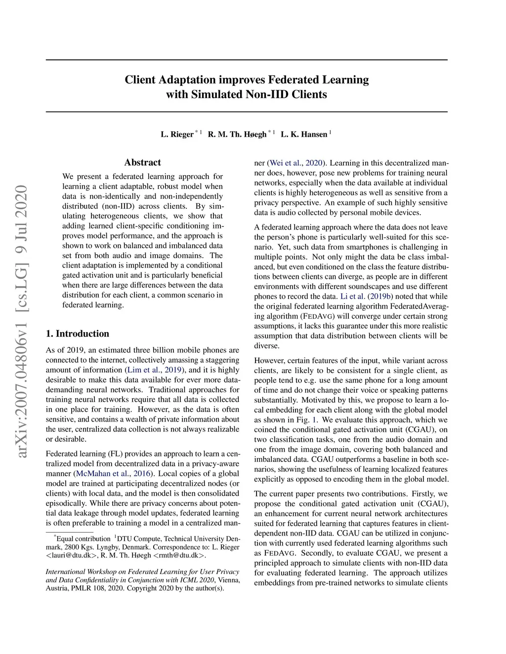 We present a federated learning approach for learning a client adaptable, robust model when data is non-identically and non-independently distributed (non-IID) across clients. By simulating heterogeneous clients, we show that adding learned client-specific conditioning improves model performance, and the approach is shown to work on balanced and imbalanced data set from both audio and image domains. The client adaptation is implemented by a conditional gated activation unit and is particularly beneficial when there are large differences between the data distribution for each client, a common scenario in federated learning.