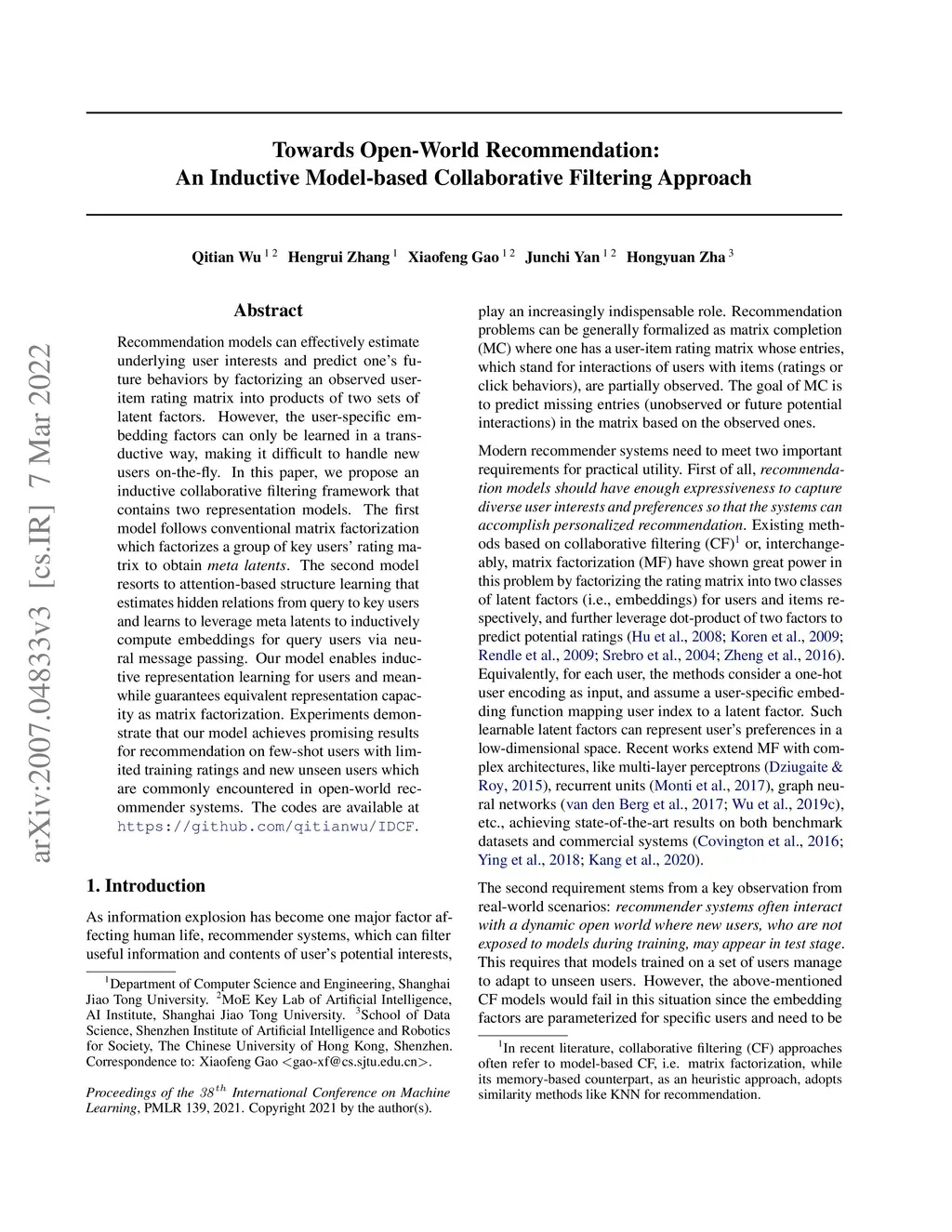 Recommendation models can effectively estimate underlying user interests and predict one's future behaviors by factorizing an observed user-item rating matrix into products of two sets of latent factors. However, the user-specific embedding factors can only be learned in a transductive way, making it difficult to handle new users on-the-fly. In this paper, we propose an inductive collaborative filtering framework that contains two representation models. The first model follows conventional matrix factorization which factorizes a group of key users' rating matrix to obtain meta latents. The second model resorts to attention-based structure learning that estimates hidden relations from query to key users and learns to leverage meta latents to inductively compute embeddings for query users via neural message passing. Our model enables inductive representation learning for users and meanwhile guarantees equivalent representation capacity as matrix factorization. Experiments demonstrate that our model achieves promising results for recommendation on few-shot users with limited training ratings and new unseen users which are commonly encountered in open-world recommender systems.