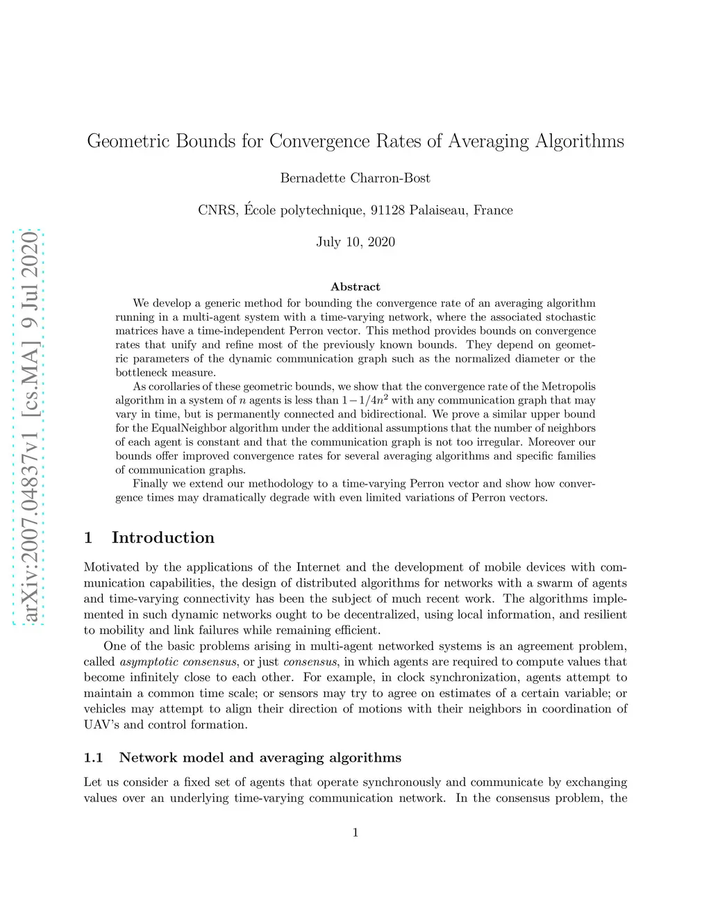 We develop a generic method for bounding the convergence rate of an averaging algorithm running in a multi-agent system with a time-varying network, where the associated stochastic matrices have a time-independent Perron vector. This method provides bounds on convergence rates that unify and refine most of the previously known bounds. They depend on geometric parameters of the dynamic communication graph such as the normalized diameter or the bottleneck measure. As corollaries of these geometric bounds, we show that the convergence rate of the Metropolis algorithm in a system of agents is less than with any communication graph that may vary in time, but is permanently connected and bidirectional. We prove a similar upper bound for the EqualNeighbor algorithm under the additional assumptions that the number of neighbors of each agent is constant and that the communication graph is not too irregular. Moreover our bounds offer improved convergence rates for several averaging algorithms and specific families of communication graphs. Finally we extend our methodology to a time-varying Perron vector and show how convergence times may dramatically degrade with even limited variations of Perron vectors.