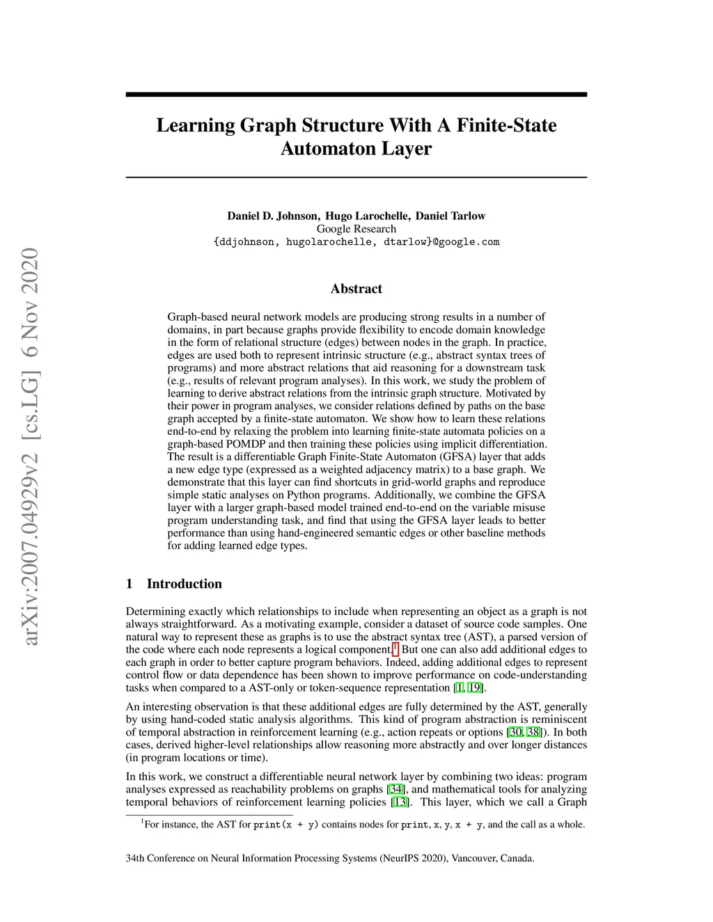 Graph-based neural network models are producing strong results in a number of domains, in part because graphs provide flexibility to encode domain knowledge in the form of relational structure (edges) between nodes in the graph. In practice, edges are used both to represent intrinsic structure (e.g., abstract syntax trees of programs) and more abstract relations that aid reasoning for a downstream task (e.g., results of relevant program analyses). In this work, we study the problem of learning to derive abstract relations from the intrinsic graph structure. Motivated by their power in program analyses, we consider relations defined by paths on the base graph accepted by a finite-state automaton. We show how to learn these relations end-to-end by relaxing the problem into learning finite-state automata policies on a graph-based POMDP and then training these policies using implicit differentiation. The result is a differentiable Graph Finite-State Automaton (GFSA) layer that adds a new edge type (expressed as a weighted adjacency matrix) to a base graph. We demonstrate that this layer can find shortcuts in grid-world graphs and reproduce simple static analyses on Python programs. Additionally, we combine the GFSA layer with a larger graph-based model trained end-to-end on the variable misuse program understanding task, and find that using the GFSA layer leads to better performance than using hand-engineered semantic edges or other baseline methods for adding learned edge types.