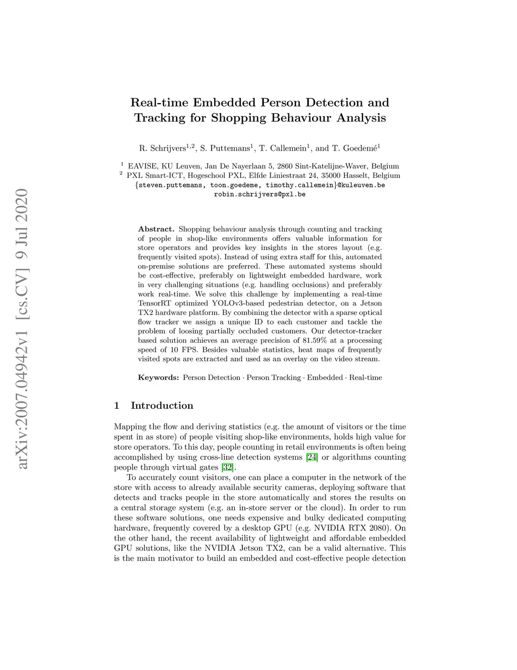 Shopping behaviour analysis through counting and tracking of people in shop-like environments offers valuable information for store operators and provides key insights in the stores layout (e.g. frequently visited spots). Instead of using extra staff for this, automated on-premise solutions are preferred. These automated systems should be cost-effective, preferably on lightweight embedded hardware, work in very challenging situations (e.g. handling occlusions) and preferably work real-time. We solve this challenge by implementing a real-time TensorRT optimized YOLOv3-based pedestrian detector, on a Jetson TX2 hardware platform. By combining the detector with a sparse optical flow tracker we assign a unique ID to each customer and tackle the problem of loosing partially occluded customers. Our detector-tracker based solution achieves an average precision of 81.59% at a processing speed of 10 FPS. Besides valuable statistics, heat maps of frequently visited spots are extracted and used as an overlay on the video stream.