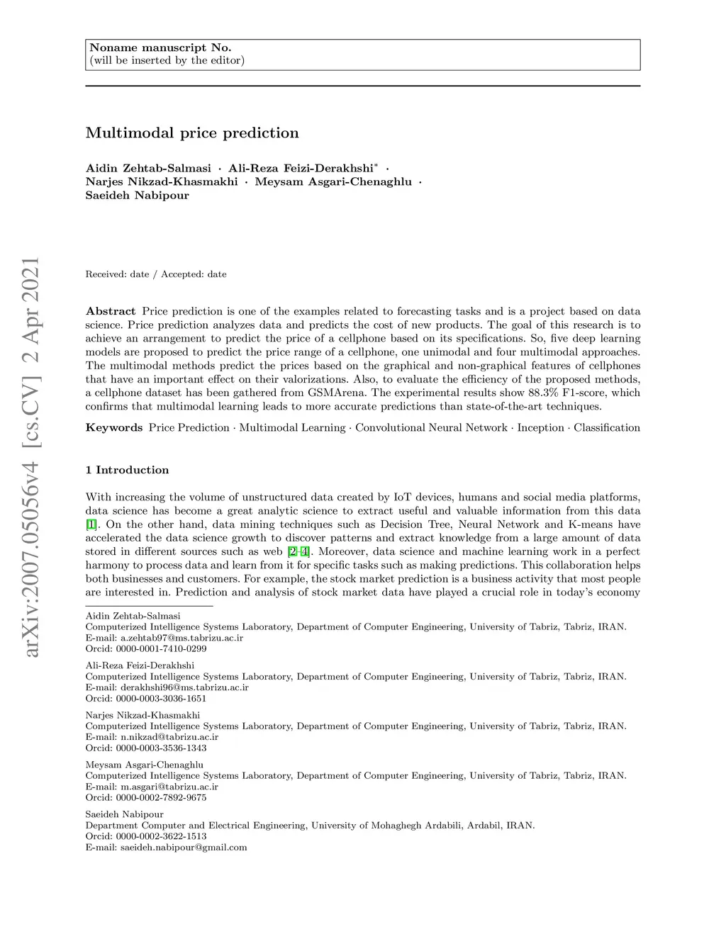 Price prediction is one of the examples related to forecasting tasks and is a project based on data science. Price prediction analyzes data and predicts the cost of new products. The goal of this research is to achieve an arrangement to predict the price of a cellphone based on its specifications. So, five deep learning models are proposed to predict the price range of a cellphone, one unimodal and four multimodal approaches. The multimodal methods predict the prices based on the graphical and non-graphical features of cellphones that have an important effect on their valorizations. Also, to evaluate the efficiency of the proposed methods, a cellphone dataset has been gathered from GSMArena. The experimental results show 88.3% F1-score, which confirms that multimodal learning leads to more accurate predictions than state-of-the-art techniques.
