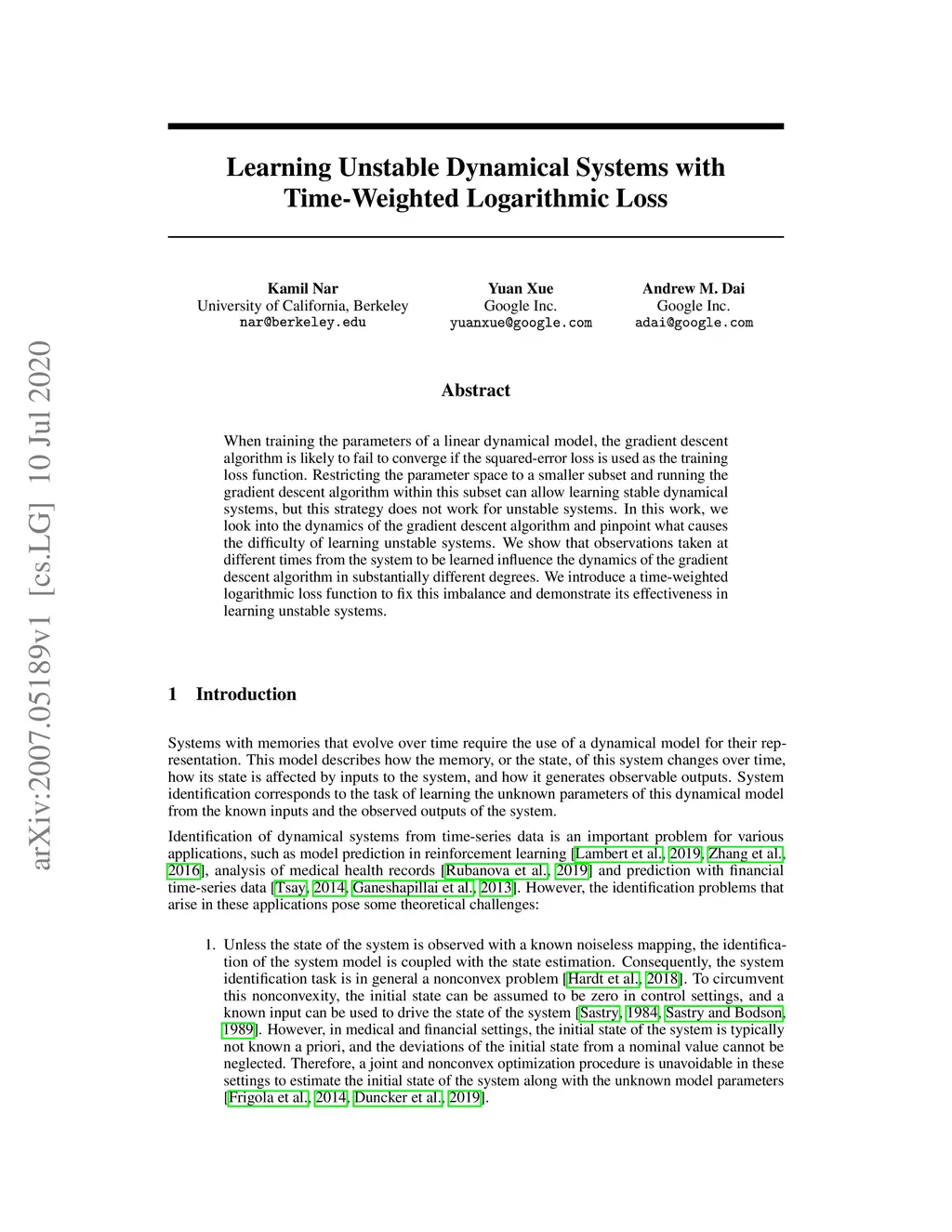 Learning Unstable Dynamical Systems with Time-Weighted Logarithmic Loss