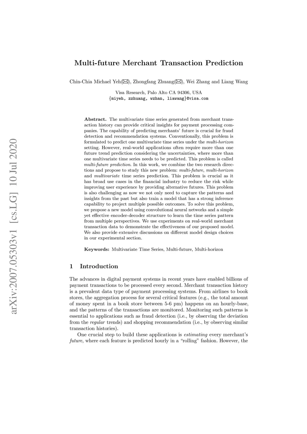 The multivariate time series generated from merchant transaction history can provide critical insights for payment processing companies. The capability of predicting merchants' future is crucial for fraud detection and recommendation systems. Conventionally, this problem is formulated to predict one multivariate time series under the multi-horizon setting. However, real-world applications often require more than one future trend prediction considering the uncertainties, where more than one multivariate time series needs to be predicted. This problem is called multi-future prediction. In this work, we combine the two research directions and propose to study this new problem: multi-future, multi-horizon and multivariate time series prediction. This problem is crucial as it has broad use cases in the financial industry to reduce the risk while improving user experience by providing alternative futures. This problem is also challenging as now we not only need to capture the patterns and insights from the past but also train a model that has a strong inference capability to project multiple possible outcomes. To solve this problem, we propose a new model using convolutional neural networks and a simple yet effective encoder-decoder structure to learn the time series pattern from multiple perspectives. We use experiments on real-world merchant transaction data to demonstrate the effectiveness of our proposed model. We also provide extensive discussions on different model design choices in our experimental section.