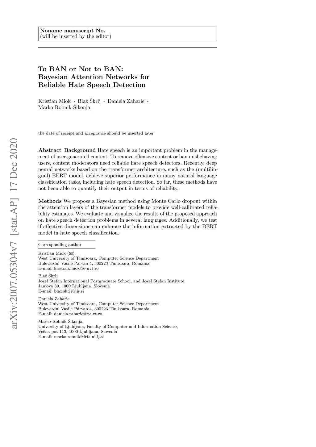 Hate speech is an important problem in the management of user-generated content. To remove offensive content or ban misbehaving users, content moderators need reliable hate speech detectors. Recently, deep neural networks based on the transformer architecture, such as the (multilingual) BERT model, achieve superior performance in many natural language classification tasks, including hate speech detection. So far, these methods have not been able to quantify their output in terms of reliability. We propose a Bayesian method using Monte Carlo dropout within the attention layers of the transformer models to provide well-calibrated reliability estimates. We evaluate and visualize the results of the proposed approach on hate speech detection problems in several languages. Additionally, we test if affective dimensions can enhance the information extracted by the BERT model in hate speech classification. Our experiments show that Monte Carlo dropout provides a viable mechanism for reliability estimation in transformer networks. Used within the BERT model, it ofers state-of-the-art classification performance and can detect less trusted predictions. Also, it was observed that affective dimensions extracted using sentic computing methods can provide insights toward interpretation of emotions involved in hate speech. Our approach not only improves the classification performance of the state-of-the-art multilingual BERT model but the computed reliability scores also significantly reduce the workload in an inspection of ofending cases and reannotation campaigns. The provided visualization helps to understand the borderline outcomes.