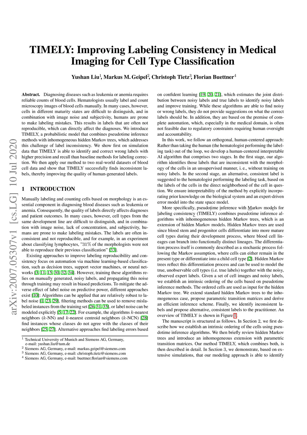 Diagnosing diseases such as leukemia or anemia requires reliable counts of blood cells. Hematologists usually label and count microscopy images of blood cells manually. In many cases, however, cells in different maturity states are difficult to distinguish, and in combination with image noise and subjectivity, humans are prone to make labeling mistakes. This results in labels that are often not reproducible, which can directly affect the diagnoses. We introduce TIMELY, a probabilistic model that combines pseudotime inference methods with inhomogeneous hidden Markov trees, which addresses this challenge of label inconsistency. We show first on simulation data that TIMELY is able to identify and correct wrong labels with higher precision and recall than baseline methods for labeling correction. We then apply our method to two real-world datasets of blood cell data and show that TIMELY successfully finds inconsistent labels, thereby improving the quality of human-generated labels.