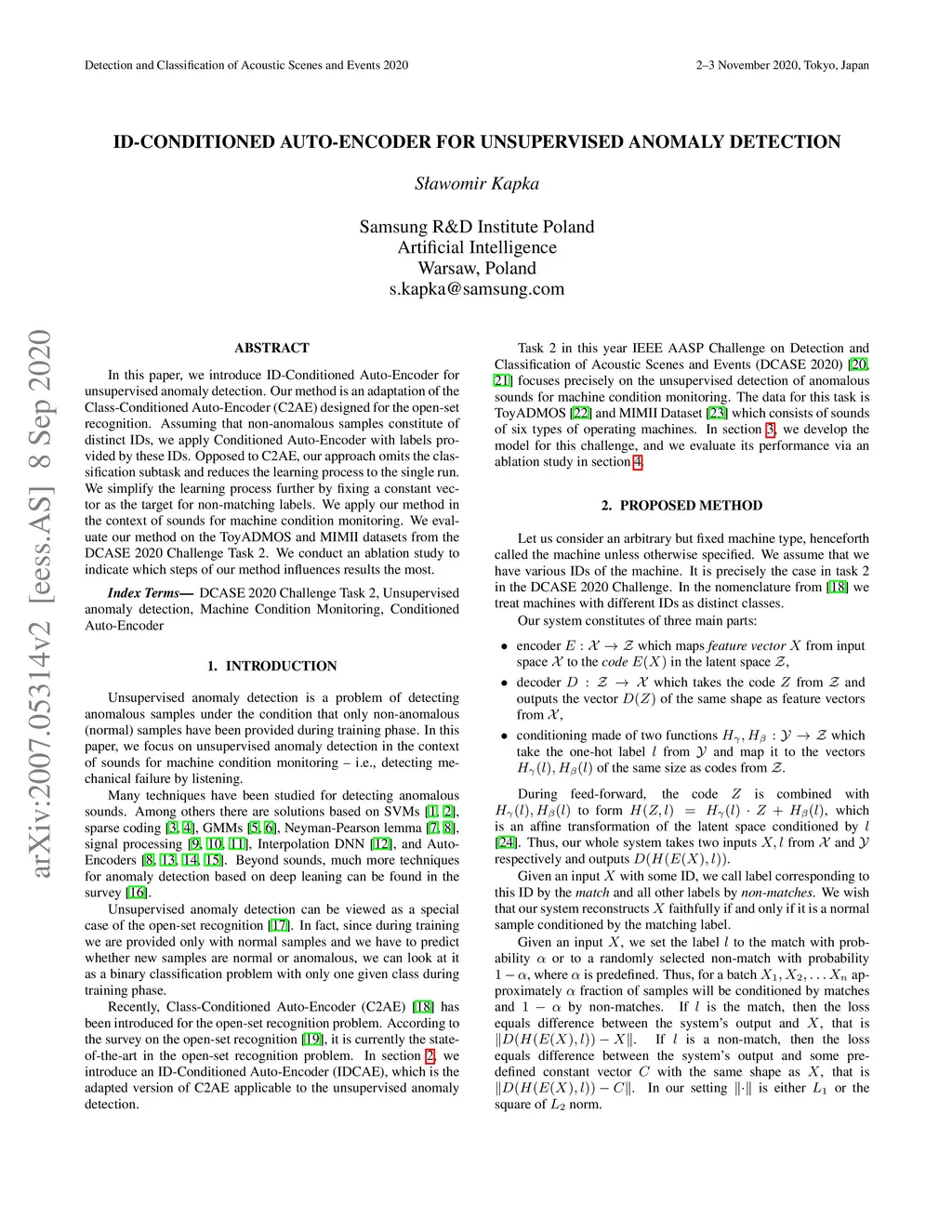 In this paper, we introduce ID-Conditioned Auto-Encoder for unsupervised anomaly detection. Our method is an adaptation of the Class-Conditioned Auto-Encoder (C2AE) designed for the open-set recognition. Assuming that non-anomalous samples constitute of distinct IDs, we apply Conditioned Auto-Encoder with labels provided by these IDs. Opposed to C2AE, our approach omits the classification subtask and reduces the learning process to the single run. We simplify the learning process further by fixing a constant vector as the target for non-matching labels. We apply our method in the context of sounds for machine condition monitoring. We evaluate our method on the ToyADMOS and MIMII datasets from the DCASE 2020 Challenge Task 2. We conduct an ablation study to indicate which steps of our method influences results the most.