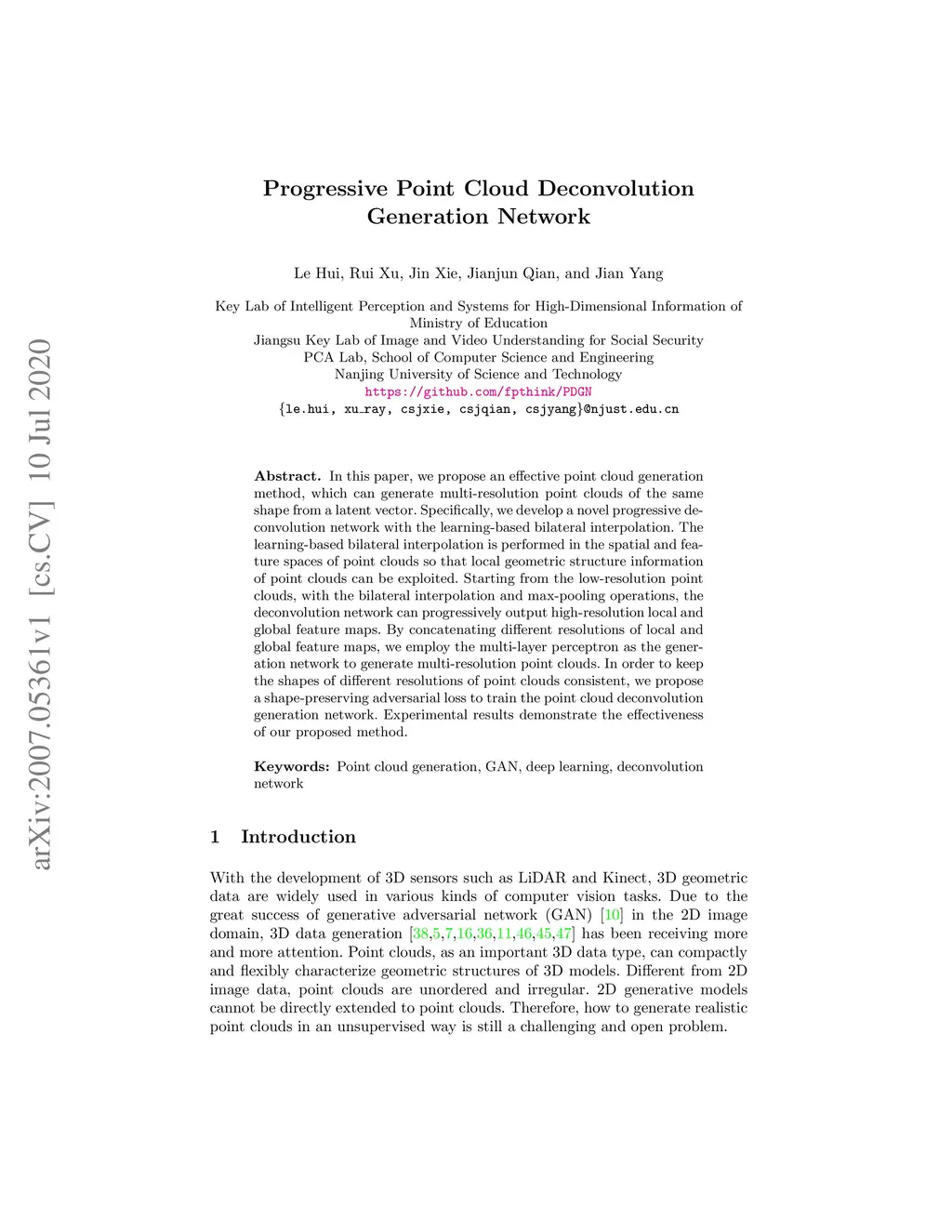In this paper, we propose an effective point cloud generation method, which can generate multi-resolution point clouds of the same shape from a latent vector. Specifically, we develop a novel progressive deconvolution network with the learning-based bilateral interpolation. The learning-based bilateral interpolation is performed in the spatial and feature spaces of point clouds so that local geometric structure information of point clouds can be exploited. Starting from the low-resolution point clouds, with the bilateral interpolation and max-pooling operations, the deconvolution network can progressively output high-resolution local and global feature maps. By concatenating different resolutions of local and global feature maps, we employ the multi-layer perceptron as the generation network to generate multi-resolution point clouds. In order to keep the shapes of different resolutions of point clouds consistent, we propose a shape-preserving adversarial loss to train the point cloud deconvolution generation network. Experimental results demonstrate the effectiveness of our proposed method.