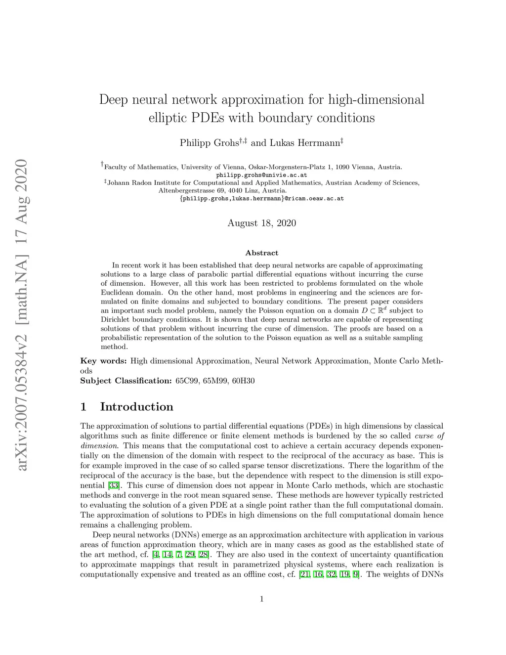 In recent work it has been established that deep neural networks are capable of approximating solutions to a large class of parabolic partial differential equations without incurring the curse of dimension. However, all this work has been restricted to problems formulated on the whole Euclidean domain. On the other hand, most problems in engineering and the sciences are formulated on finite domains and subjected to boundary conditions. The present paper considers an important such model problem, namely the Poisson equation on a domain subject to Dirichlet boundary conditions. It is shown that deep neural networks are capable of representing solutions of that problem without incurring the curse of dimension. The proofs are based on a probabilistic representation of the solution to the Poisson equation as well as a suitable sampling method.