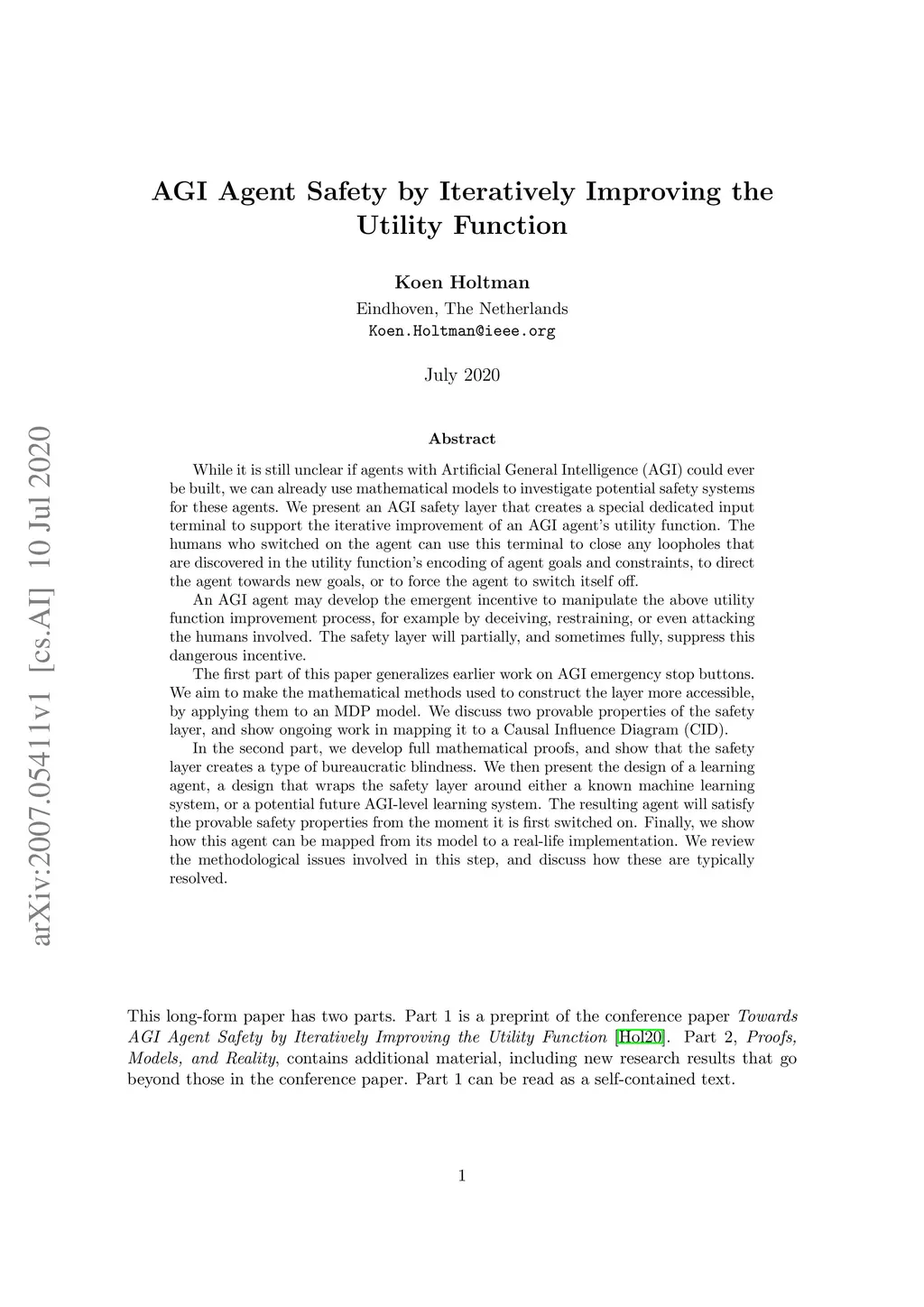 While it is still unclear if agents with Artificial General Intelligence (AGI) could ever be built, we can already use mathematical models to investigate potential safety systems for these agents. We present an AGI safety layer that creates a special dedicated input terminal to support the iterative improvement of an AGI agent's utility function. The humans who switched on the agent can use this terminal to close any loopholes that are discovered in the utility function's encoding of agent goals and constraints, to direct the agent towards new goals, or to force the agent to switch itself off. An AGI agent may develop the emergent incentive to manipulate the above utility function improvement process, for example by deceiving, restraining, or even attacking the humans involved. The safety layer will partially, and sometimes fully, suppress this dangerous incentive. The first part of this paper generalizes earlier work on AGI emergency stop buttons. We aim to make the mathematical methods used to construct the layer more accessible, by applying them to an MDP model. We discuss two provable properties of the safety layer, and show ongoing work in mapping it to a Causal Influence Diagram (CID). In the second part, we develop full mathematical proofs, and show that the safety layer creates a type of bureaucratic blindness. We then present the design of a learning agent, a design that wraps the safety layer around either a known machine learning system, or a potential future AGI-level learning system. The resulting agent will satisfy the provable safety properties from the moment it is first switched on. Finally, we show how this agent can be mapped from its model to a real-life implementation. We review the methodological issues involved in this step, and discuss how these are typically resolved.