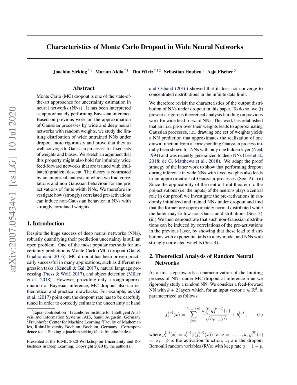 Monte Carlo (MC) dropout is one of the state-of-the-art approaches for uncertainty estimation in neural networks (NNs). It has been interpreted as approximately performing Bayesian inference. Based on previous work on the approximation of Gaussian processes by wide and deep neural networks with random weights, we study the limiting distribution of wide untrained NNs under dropout more rigorously and prove that they as well converge to Gaussian processes for fixed sets of weights and biases. We sketch an argument that this property might also hold for infinitely wide feed-forward networks that are trained with (full-batch) gradient descent. The theory is contrasted by an empirical analysis in which we find correlations and non-Gaussian behaviour for the pre-activations of finite width NNs. We therefore investigate how (strongly) correlated pre-activations can induce non-Gaussian behavior in NNs with strongly correlated weights.