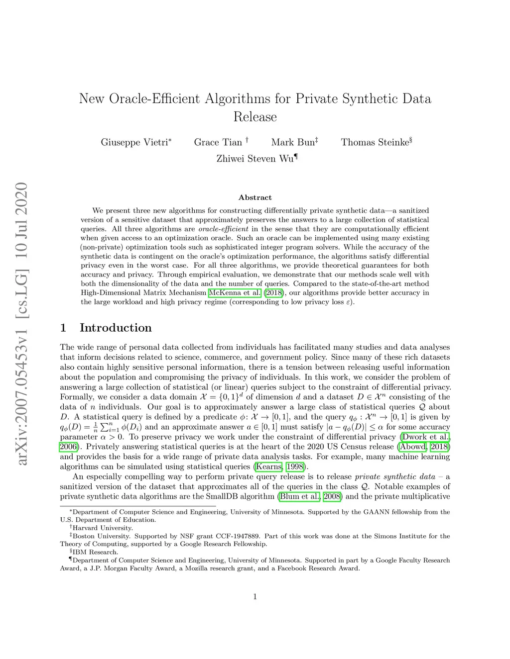 We present three new algorithms for constructing differentially private synthetic data---a sanitized version of a sensitive dataset that approximately preserves the answers to a large collection of statistical queries. All three algorithms are \emph{oracle-efficient} in the sense that they are computationally efficient when given access to an optimization oracle. Such an oracle can be implemented using many existing (non-private) optimization tools such as sophisticated integer program solvers. While the accuracy of the synthetic data is contingent on the oracle's optimization performance, the algorithms satisfy differential privacy even in the worst case. For all three algorithms, we provide theoretical guarantees for both accuracy and privacy. Through empirical evaluation, we demonstrate that our methods scale well with both the dimensionality of the data and the number of queries. Compared to the state-of-the-art method High-Dimensional Matrix Mechanism \cite{McKennaMHM18}, our algorithms provide better accuracy in the large workload and high privacy regime (corresponding to low privacy loss ).