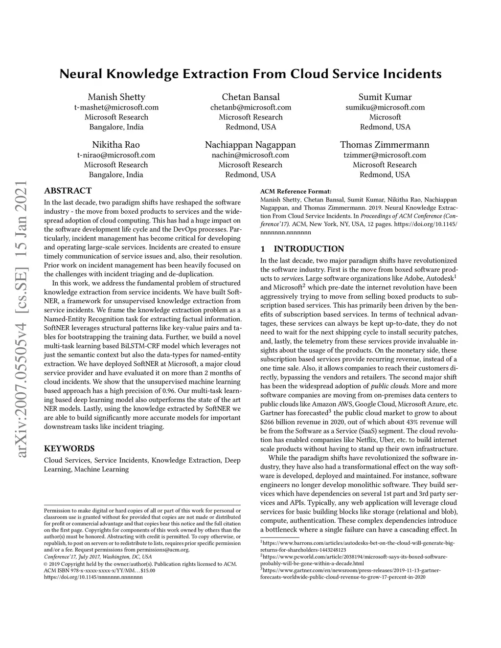 In the last decade, two paradigm shifts have reshaped the software industry - the move from boxed products to services and the widespread adoption of cloud computing. This has had a huge impact on the software development life cycle and the DevOps processes. Particularly, incident management has become critical for developing and operating large-scale services. Incidents are created to ensure timely communication of service issues and, also, their resolution. Prior work on incident management has been heavily focused on the challenges with incident triaging and de-duplication. In this work, we address the fundamental problem of structured knowledge extraction from service incidents. We have built SoftNER, a framework for unsupervised knowledge extraction from service incidents. We frame the knowledge extraction problem as a Named-entity Recognition task for extracting factual information. SoftNER leverages structural patterns like key,value pairs and tables for bootstrapping the training data. Further, we build a novel multi-task learning based BiLSTM-CRF model which leverages not just the semantic context but also the data-types for named-entity extraction. We have deployed SoftNER at Microsoft, a major cloud service provider and have evaluated it on more than 2 months of cloud incidents. We show that the unsupervised machine learning based approach has a high precision of 0.96. Our multi-task learning based deep learning model also outperforms the state of the art NER models. Lastly, using the knowledge extracted by SoftNER we are able to build significantly more accurate models for important downstream tasks like incident triaging.