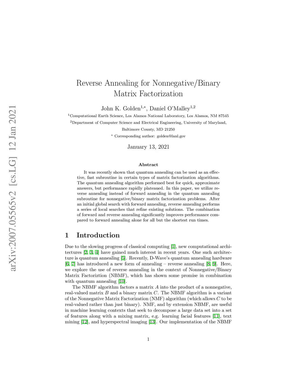 Reverse Annealing for Nonnegative/Binary Matrix Factorization