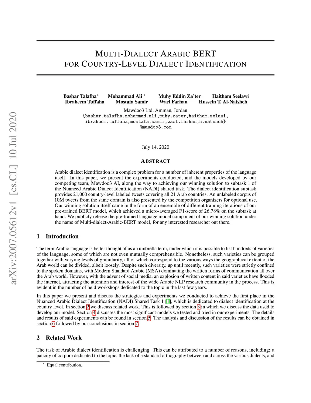 Arabic dialect identification is a complex problem for a number of inherent properties of the language itself. In this paper, we present the experiments conducted, and the models developed by our competing team, Mawdoo3 AI, along the way to achieving our winning solution to subtask 1 of the Nuanced Arabic Dialect Identification (NADI) shared task. The dialect identification subtask provides 21,000 country-level labeled tweets covering all 21 Arab countries. An unlabeled corpus of 10M tweets from the same domain is also presented by the competition organizers for optional use. Our winning solution itself came in the form of an ensemble of different training iterations of our pre-trained BERT model, which achieved a micro-averaged F1-score of 26.78% on the subtask at hand. We publicly release the pre-trained language model component of our winning solution under the name of Multi-dialect-Arabic-BERT model, for any interested researcher out there.