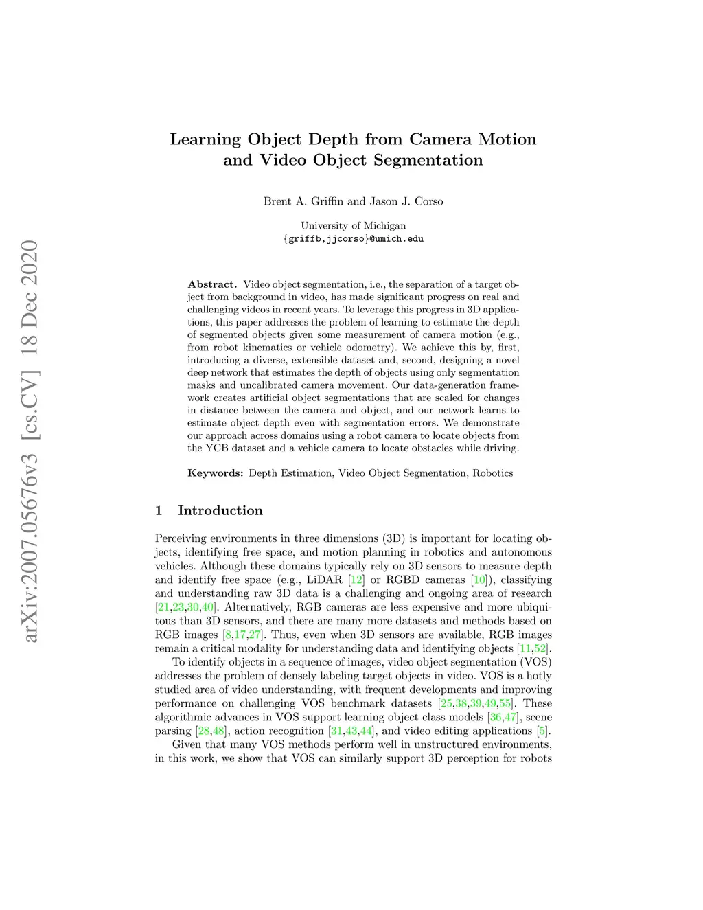 Learning Object Depth from Camera Motion and Video Object Segmentation