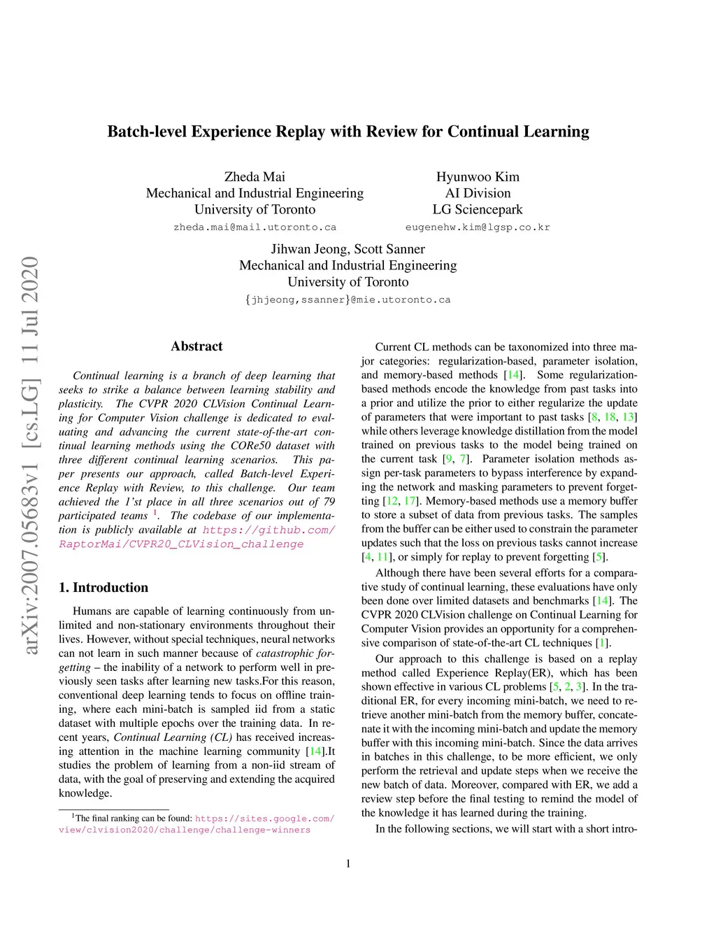 Continual learning is a branch of deep learning that seeks to strike a balance between learning stability and plasticity. The CVPR 2020 CLVision Continual Learning for Computer Vision challenge is dedicated to evaluating and advancing the current state-of-the-art continual learning methods using the CORe50 dataset with three different continual learning scenarios. This paper presents our approach, called Batch-level Experience Replay with Review, to this challenge. Our team achieved the 1'st place in all three scenarios out of 79 participated teams. The codebase of our implementation is publicly available at https://github.com/RaptorMai/CVPR20_CLVision_challenge