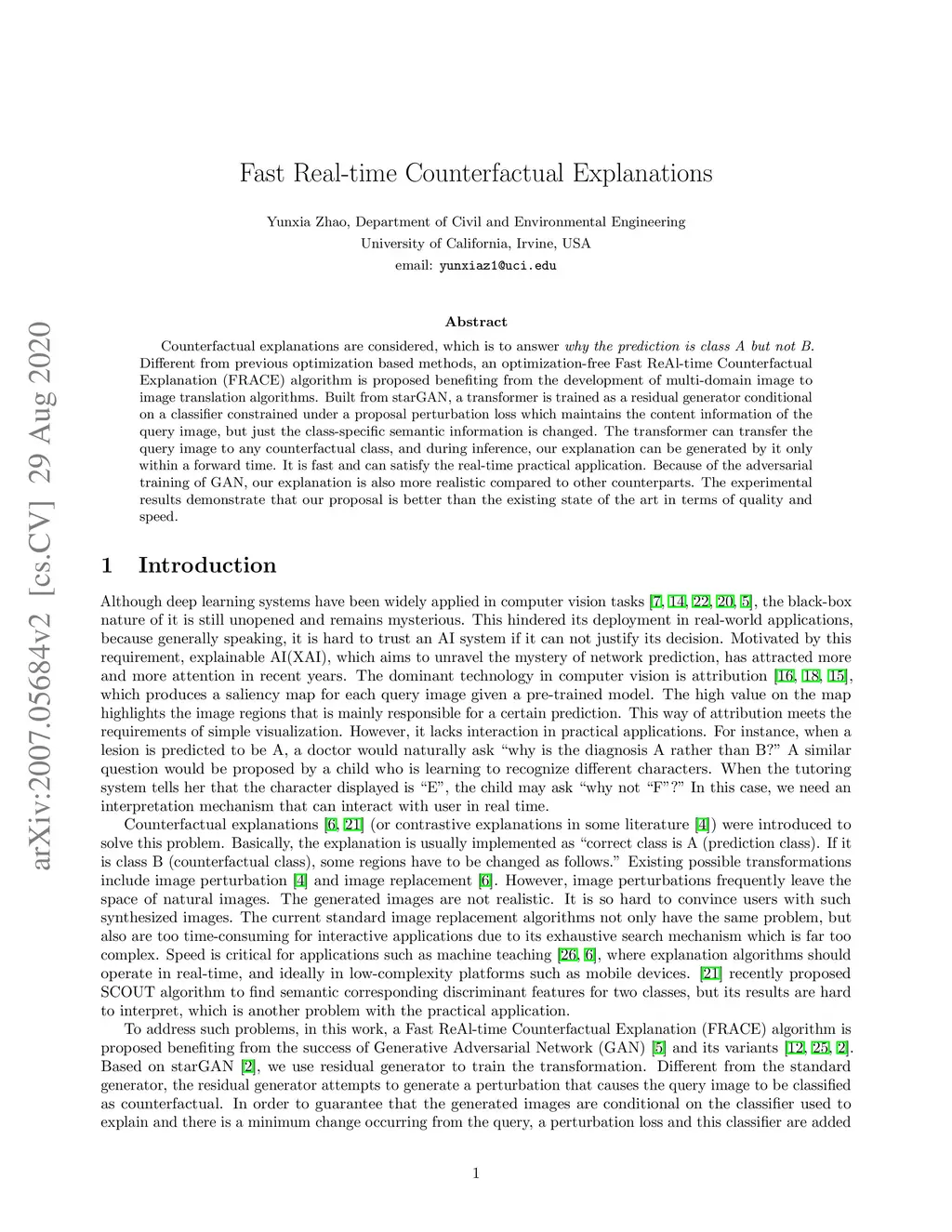 Counterfactual explanations are considered, which is to answer {\it why the prediction is class A but not B.} Different from previous optimization based methods, an optimization-free Fast ReAl-time Counterfactual Explanation (FRACE) algorithm is proposed benefiting from the development of multi-domain image to image translation algorithms. Built from starGAN, a transformer is trained as a residual generator conditional on a classifier constrained under a proposal perturbation loss which maintains the content information of the query image, but just the class-specific semantic information is changed. The transformer can transfer the query image to any counterfactual class, and during inference, our explanation can be generated by it only within a forward time. It is fast and can satisfy the real-time practical application. Because of the adversarial training of GAN, our explanation is also more realistic compared to other counterparts. The experimental results demonstrate that our proposal is better than the existing state of the art in terms of quality and speed.