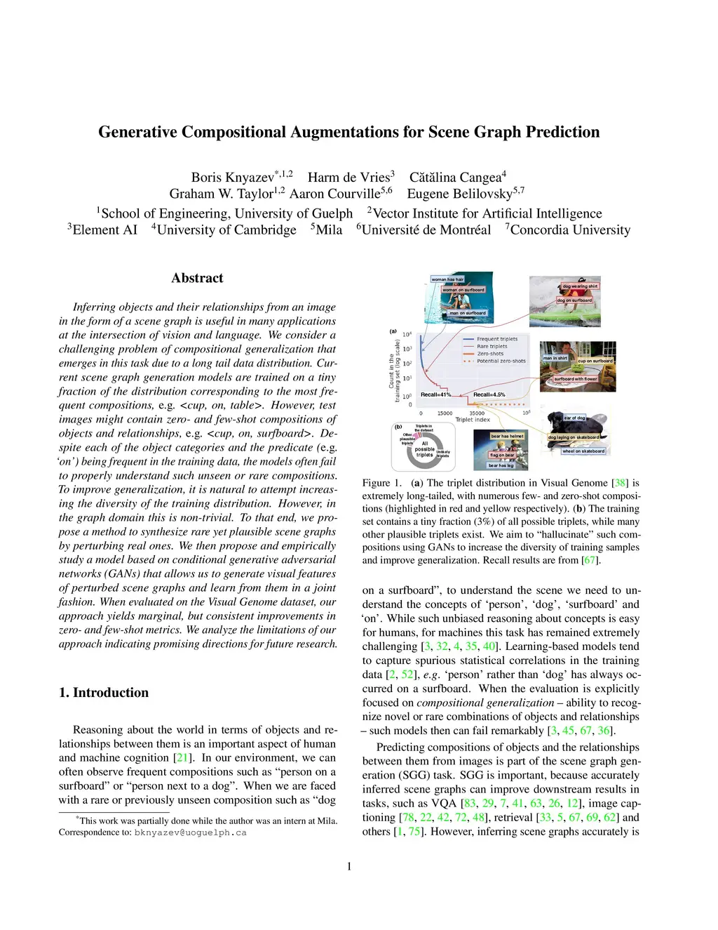 Inferring objects and their relationships from an image in the form of a scene graph is useful in many applications at the intersection of vision and language. We consider a challenging problem of compositional generalization that emerges in this task due to a long tail data distribution. Current scene graph generation models are trained on a tiny fraction of the distribution corresponding to the most frequent compositions, e.g. <cup, on, table>. However, test images might contain zero- and few-shot compositions of objects and relationships, e.g. <cup, on, surfboard>. Despite each of the object categories and the predicate (e.g. ón') being frequent in the training data, the models often fail to properly understand such unseen or rare compositions. To improve generalization, it is natural to attempt increasing the diversity of the training distribution. However, in the graph domain this is non-trivial. To that end, we propose a method to synthesize rare yet plausible scene graphs by perturbing real ones. We then propose and empirically study a model based on conditional generative adversarial networks (GANs) that allows us to generate visual features of perturbed scene graphs and learn from them in a joint fashion. When evaluated on the Visual Genome dataset, our approach yields marginal, but consistent improvements in zero- and few-shot metrics. We analyze the limitations of our approach indicating promising directions for future research.