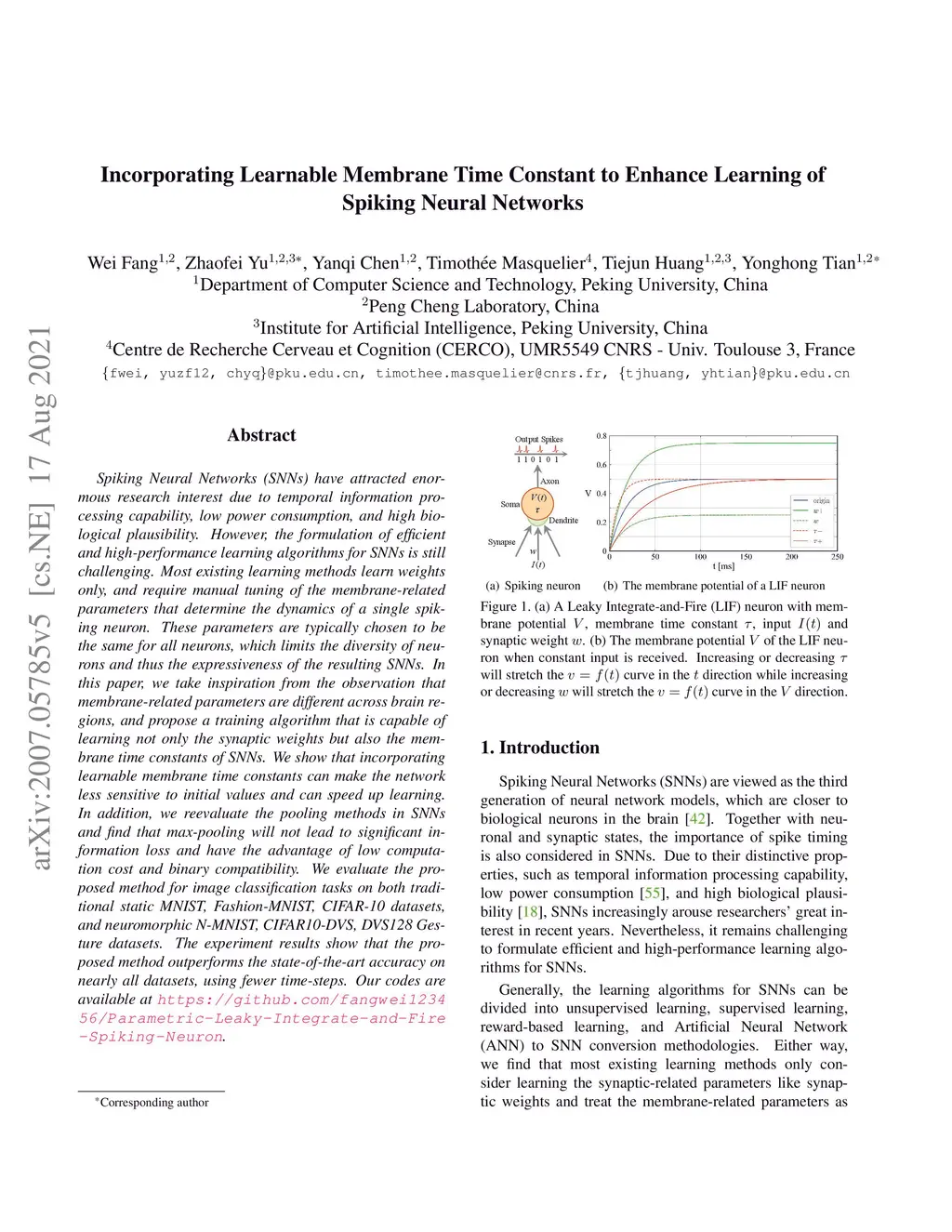 Spiking Neural Networks (SNNs) have attracted enormous research interest due to temporal information processing capability, low power consumption, and high biological plausibility. However, the formulation of efficient and high-performance learning algorithms for SNNs is still challenging. Most existing learning methods learn weights only, and require manual tuning of the membrane-related parameters that determine the dynamics of a single spiking neuron. These parameters are typically chosen to be the same for all neurons, which limits the diversity of neurons and thus the expressiveness of the resulting SNNs. In this paper, we take inspiration from the observation that membrane-related parameters are different across brain regions, and propose a training algorithm that is capable of learning not only the synaptic weights but also the membrane time constants of SNNs. We show that incorporating learnable membrane time constants can make the network less sensitive to initial values and can speed up learning. In addition, we reevaluate the pooling methods in SNNs and find that max-pooling will not lead to significant information loss and have the advantage of low computation cost and binary compatibility. We evaluate the proposed method for image classification tasks on both traditional static MNIST, Fashion-MNIST, CIFAR-10 datasets, and neuromorphic N-MNIST, CIFAR10-DVS, DVS128 Gesture datasets. The experiment results show that the proposed method outperforms the state-of-the-art accuracy on nearly all datasets, using fewer time-steps. Our codes are available at https://github.com/fangwei123456/Parametric-Leaky-Integrate-and-Fire-Spiking-Neuron.