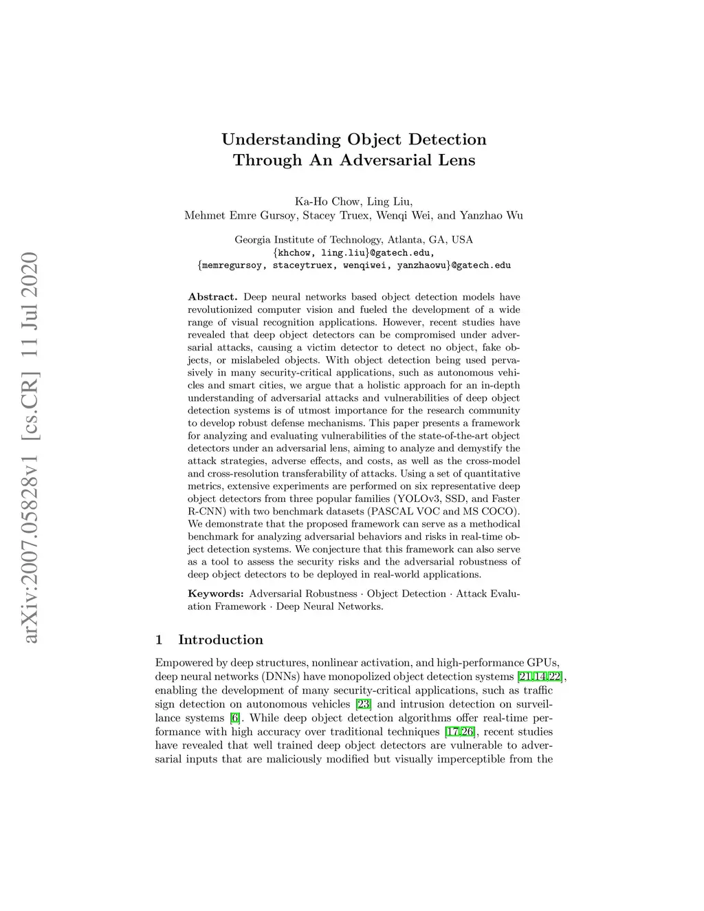 Deep neural networks based object detection models have revolutionized computer vision and fueled the development of a wide range of visual recognition applications. However, recent studies have revealed that deep object detectors can be compromised under adversarial attacks, causing a victim detector to detect no object, fake objects, or mislabeled objects. With object detection being used pervasively in many security-critical applications, such as autonomous vehicles and smart cities, we argue that a holistic approach for an in-depth understanding of adversarial attacks and vulnerabilities of deep object detection systems is of utmost importance for the research community to develop robust defense mechanisms. This paper presents a framework for analyzing and evaluating vulnerabilities of the state-of-the-art object detectors under an adversarial lens, aiming to analyze and demystify the attack strategies, adverse effects, and costs, as well as the cross-model and cross-resolution transferability of attacks. Using a set of quantitative metrics, extensive experiments are performed on six representative deep object detectors from three popular families (YOLOv3, SSD, and Faster R-CNN) with two benchmark datasets (PASCAL VOC and MS COCO). We demonstrate that the proposed framework can serve as a methodical benchmark for analyzing adversarial behaviors and risks in real-time object detection systems. We conjecture that this framework can also serve as a tool to assess the security risks and the adversarial robustness of deep object detectors to be deployed in real-world applications.