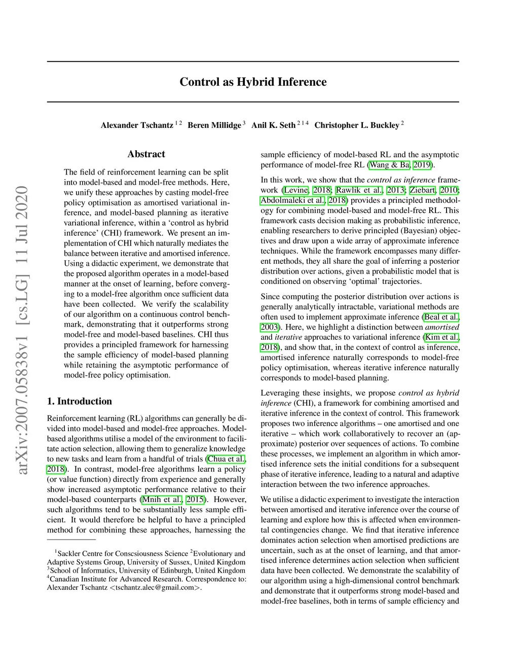 The field of reinforcement learning can be split into model-based and model-free methods. Here, we unify these approaches by casting model-free policy optimisation as amortised variational inference, and model-based planning as iterative variational inference, within a `control as hybrid inference' (CHI) framework. We present an implementation of CHI which naturally mediates the balance between iterative and amortised inference. Using a didactic experiment, we demonstrate that the proposed algorithm operates in a model-based manner at the onset of learning, before converging to a model-free algorithm once sufficient data have been collected. We verify the scalability of our algorithm on a continuous control benchmark, demonstrating that it outperforms strong model-free and model-based baselines. CHI thus provides a principled framework for harnessing the sample efficiency of model-based planning while retaining the asymptotic performance of model-free policy optimisation.