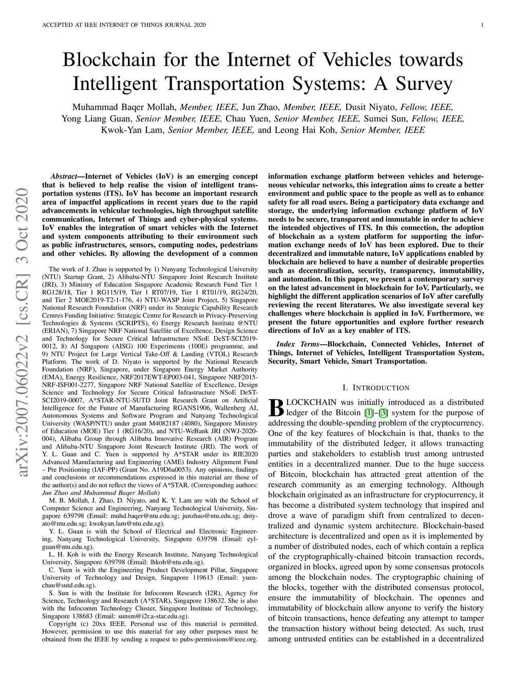 Internet of Vehicles (IoV) is an emerging concept that is believed to help realise the vision of intelligent transportation systems (ITS). IoV has become an important research area of impactful applications in recent years due to the rapid advancements in vehicular technologies, high throughput satellite communication, Internet of Things and cyber-physical systems. IoV enables the integration of smart vehicles with the Internet and system components attributing to their environment such as public infrastructures, sensors, computing nodes, pedestrians and other vehicles. By allowing the development of a common information exchange platform between vehicles and heterogeneous vehicular networks, this integration aims to create a better environment and public space to the people as well as to enhance safety for all road users. Being a participatory data exchange and storage, the underlying information exchange platform of IoV needs to be secure, transparent and immutable in order to achieve the intended objectives of ITS. In this connection, the adoption of blockchain as a system platform for supporting the information exchange needs of IoV has been explored. Due to their decentralized and immutable nature, IoV applications enabled by blockchain are believed to have a number of desirable properties such as decentralization, security, transparency, immutability, and automation. In this paper, we present a contemporary survey on the latest advancement in blockchain for IoV. Particularly, we highlight the different application scenarios of IoV after carefully reviewing the recent literatures. We also investigate several key challenges where blockchain is applied in IoV. Furthermore, we present the future opportunities and explore further research directions of IoV as a key enabler of ITS.
