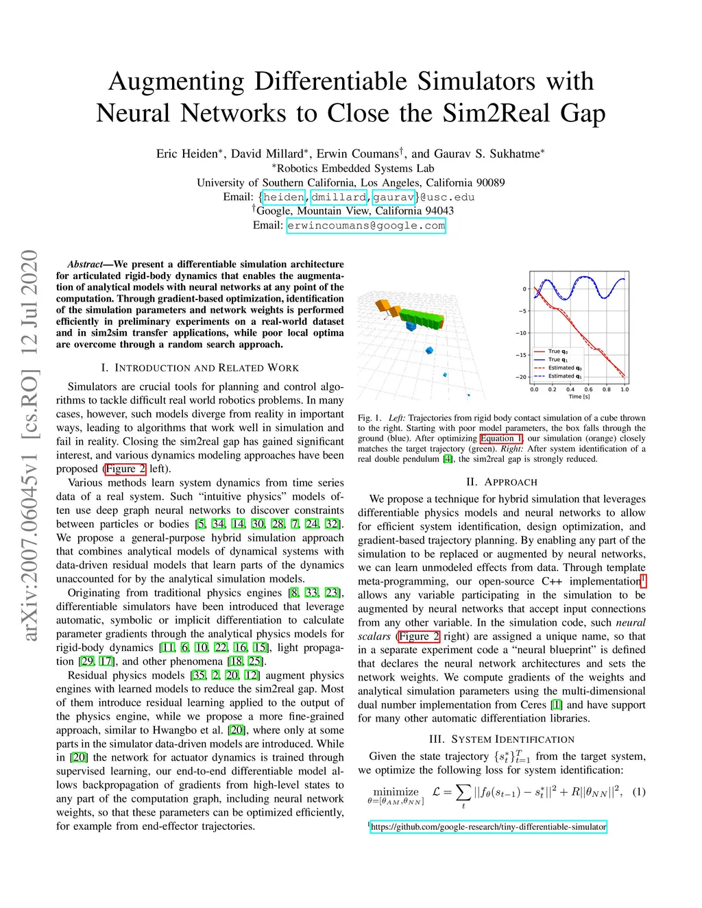 We present a differentiable simulation architecture for articulated rigid-body dynamics that enables the augmentation of analytical models with neural networks at any point of the computation. Through gradient-based optimization, identification of the simulation parameters and network weights is performed efficiently in preliminary experiments on a real-world dataset and in sim2sim transfer applications, while poor local optima are overcome through a random search approach.