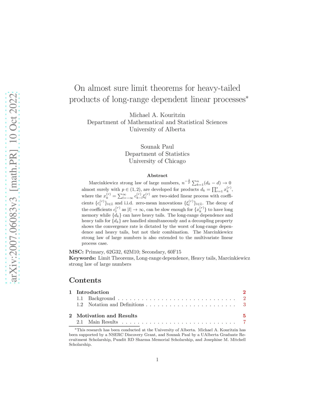 Marcinkiewicz strong law of large numbers, ${n^{-\frac1p}}\sum_{k=1}^{n} (d_{k}- d)\rightarrow 0\ $ almost surely with , are developed for products , where the are two-sided linear processes with coefficients and i.i.d. zero-mean innovations . The decay of the coefficients as , can be slow enough for to have long memory while can have heavy tails. The long-range dependence and heavy tails for are handled simultaneously and a decoupling property shows the convergence rate is dictated by the worst of long-range dependence and heavy tails, but not their combination. The Marcinkiewicz strong law of large numbers is also extended to the multivariate linear process case.