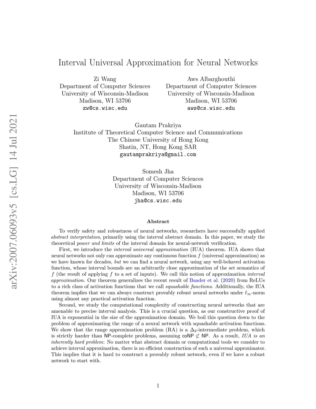 To verify safety and robustness of neural networks, researchers have successfully applied abstract interpretation, primarily using the interval abstract domain. In this paper, we study the theoretical power and limits of the interval domain for neural-network verification. First, we introduce the interval universal approximation (IUA) theorem. IUA shows that neural networks not only can approximate any continuous function (universal approximation) as we have known for decades, but we can find a neural network, using any well-behaved activation function, whose interval bounds are an arbitrarily close approximation of the set semantics of (the result of applying to a set of inputs). We call this notion of approximation interval approximation. Our theorem generalizes the recent result of Baader et al. (2020) from ReLUs to a rich class of activation functions that we call squashable functions. Additionally, the IUA theorem implies that we can always construct provably robust neural networks under -norm using almost any practical activation function. Second, we study the computational complexity of constructing neural networks that are amenable to precise interval analysis. This is a crucial question, as our constructive proof of IUA is exponential in the size of the approximation domain. We boil this question down to the problem of approximating the range of a neural network with squashable activation functions. We show that the range approximation problem (RA) is a -intermediate problem, which is strictly harder than -complete problems, assuming . As a result, IUA is an inherently hard problem: No matter what abstract domain or computational tools we consider to achieve interval approximation, there is no efficient construction of such a universal approximator.