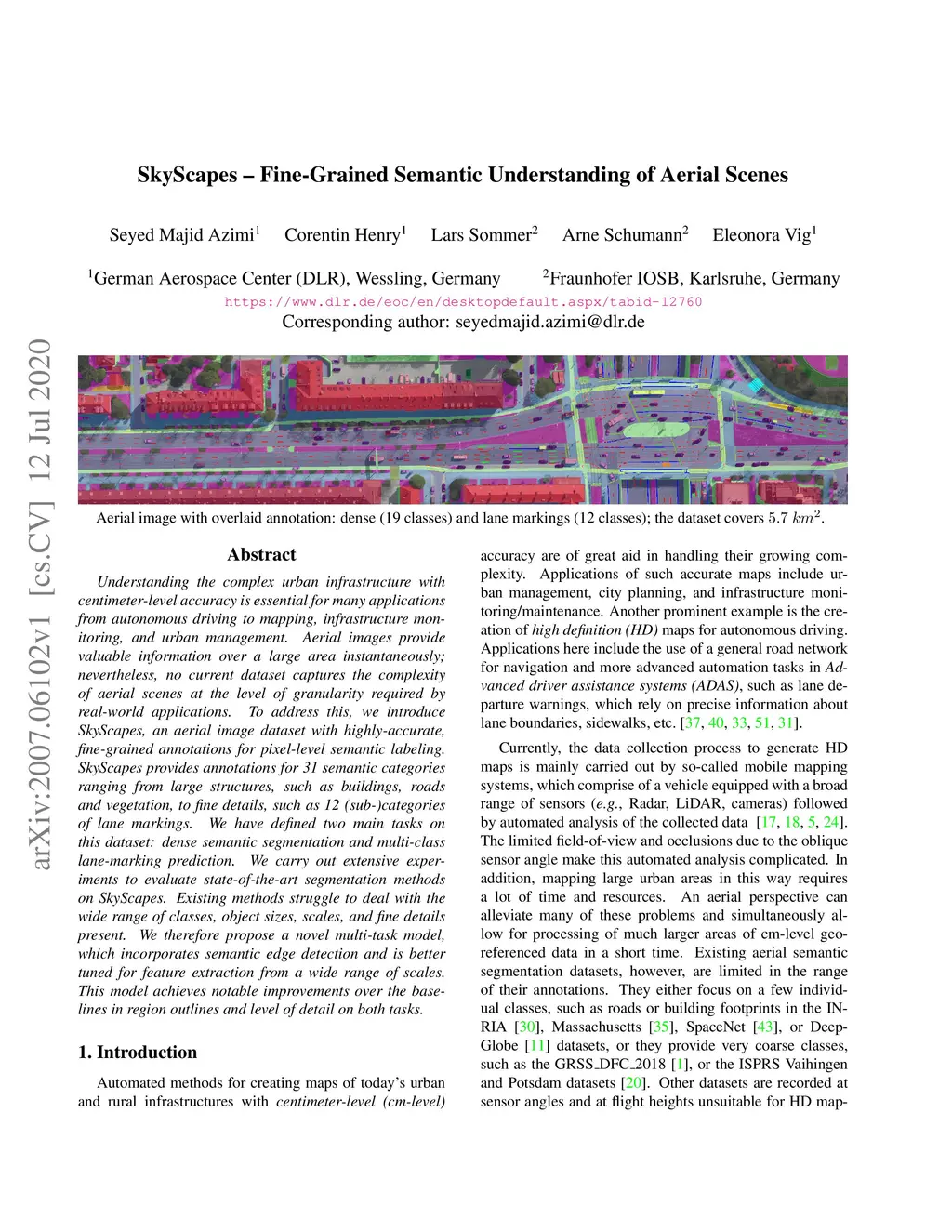 Understanding the complex urban infrastructure with centimeter-level accuracy is essential for many applications from autonomous driving to mapping, infrastructure monitoring, and urban management. Aerial images provide valuable information over a large area instantaneously; nevertheless, no current dataset captures the complexity of aerial scenes at the level of granularity required by real-world applications. To address this, we introduce SkyScapes, an aerial image dataset with highly-accurate, fine-grained annotations for pixel-level semantic labeling. SkyScapes provides annotations for 31 semantic categories ranging from large structures, such as buildings, roads and vegetation, to fine details, such as 12 (sub-)categories of lane markings. We have defined two main tasks on this dataset: dense semantic segmentation and multi-class lane-marking prediction. We carry out extensive experiments to evaluate state-of-the-art segmentation methods on SkyScapes. Existing methods struggle to deal with the wide range of classes, object sizes, scales, and fine details present. We therefore propose a novel multi-task model, which incorporates semantic edge detection and is better tuned for feature extraction from a wide range of scales. This model achieves notable improvements over the baselines in region outlines and level of detail on both tasks.