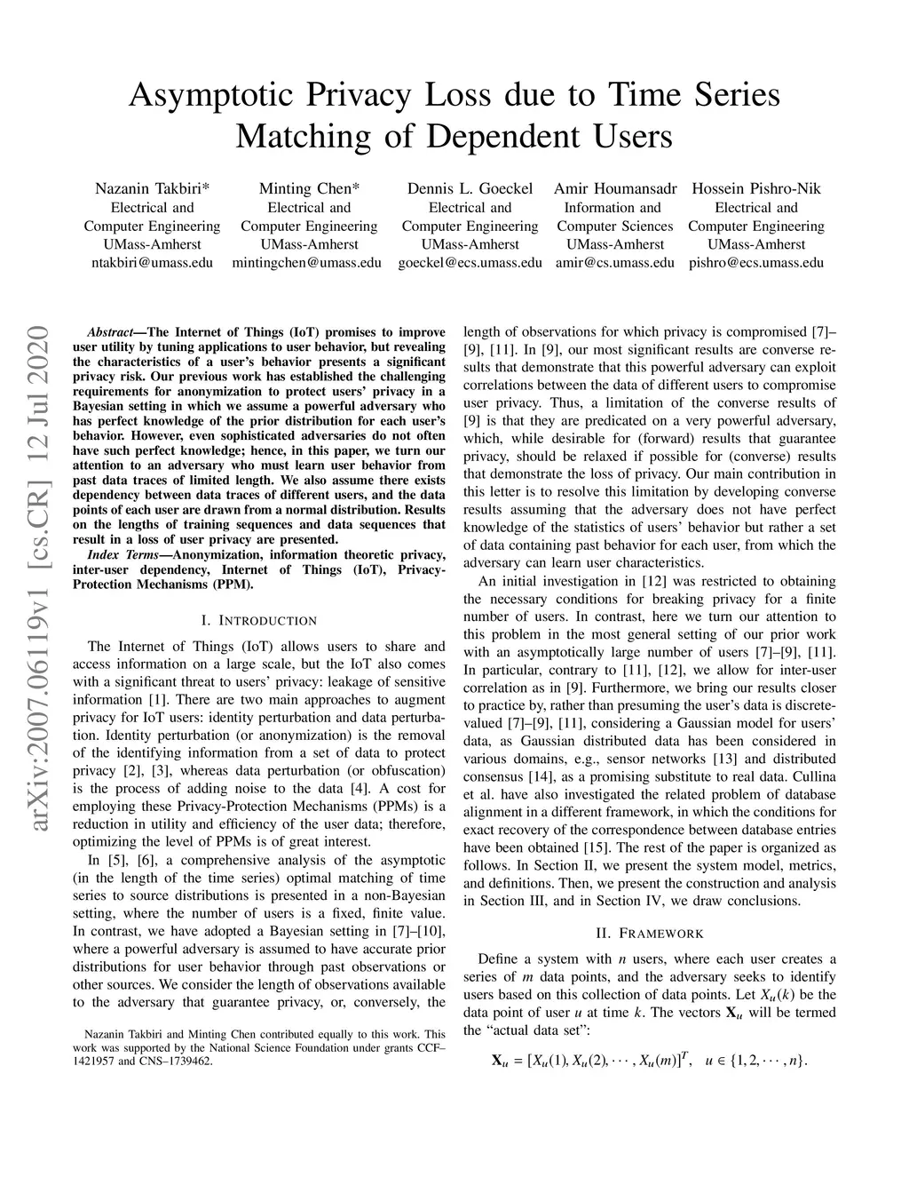 The Internet of Things (IoT) promises to improve user utility by tuning applications to user behavior, but revealing the characteristics of a user's behavior presents a significant privacy risk. Our previous work has established the challenging requirements for anonymization to protect users' privacy in a Bayesian setting in which we assume a powerful adversary who has perfect knowledge of the prior distribution for each user's behavior. However, even sophisticated adversaries do not often have such perfect knowledge; hence, in this paper, we turn our attention to an adversary who must learn user behavior from past data traces of limited length. We also assume there exists dependency between data traces of different users, and the data points of each user are drawn from a normal distribution. Results on the lengths of training sequences and data sequences that result in a loss of user privacy are presented.