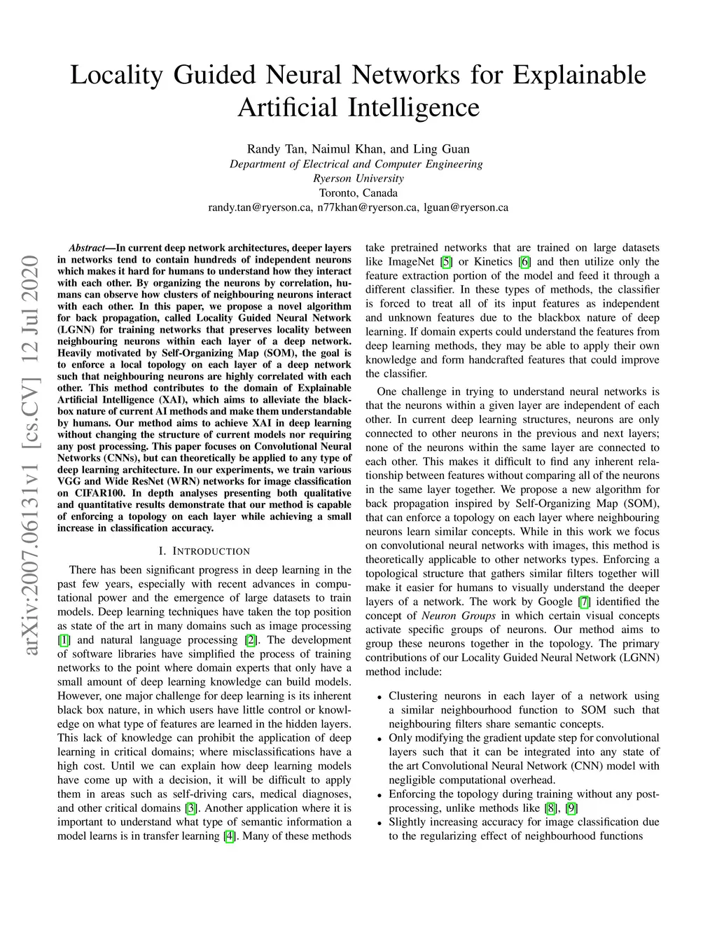 In current deep network architectures, deeper layers in networks tend to contain hundreds of independent neurons which makes it hard for humans to understand how they interact with each other. By organizing the neurons by correlation, humans can observe how clusters of neighbouring neurons interact with each other. In this paper, we propose a novel algorithm for back propagation, called Locality Guided Neural Network(LGNN) for training networks that preserves locality between neighbouring neurons within each layer of a deep network. Heavily motivated by Self-Organizing Map (SOM), the goal is to enforce a local topology on each layer of a deep network such that neighbouring neurons are highly correlated with each other. This method contributes to the domain of Explainable Artificial Intelligence (XAI), which aims to alleviate the black-box nature of current AI methods and make them understandable by humans. Our method aims to achieve XAI in deep learning without changing the structure of current models nor requiring any post processing. This paper focuses on Convolutional Neural Networks (CNNs), but can theoretically be applied to any type of deep learning architecture. In our experiments, we train various VGG and Wide ResNet (WRN) networks for image classification on CIFAR100. In depth analyses presenting both qualitative and quantitative results demonstrate that our method is capable of enforcing a topology on each layer while achieving a small increase in classification accuracy
