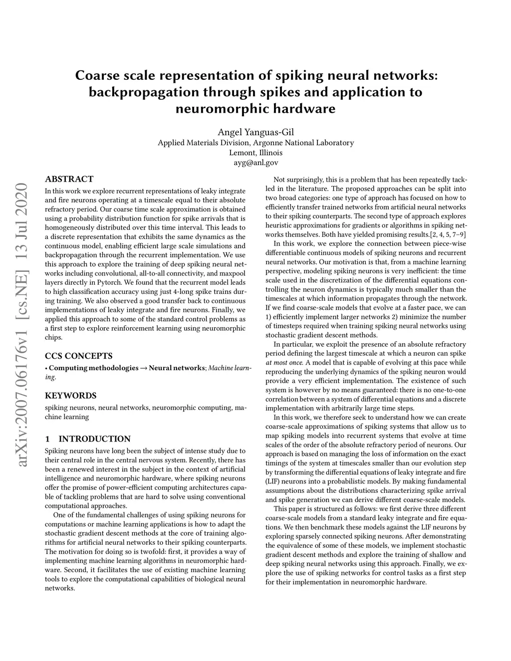 In this work we explore recurrent representations of leaky integrate and fire neurons operating at a timescale equal to their absolute refractory period. Our coarse time scale approximation is obtained using a probability distribution function for spike arrivals that is homogeneously distributed over this time interval. This leads to a discrete representation that exhibits the same dynamics as the continuous model, enabling efficient large scale simulations and backpropagation through the recurrent implementation. We use this approach to explore the training of deep spiking neural networks including convolutional, all-to-all connectivity, and maxpool layers directly in Pytorch. We found that the recurrent model leads to high classification accuracy using just 4-long spike trains during training. We also observed a good transfer back to continuous implementations of leaky integrate and fire neurons. Finally, we applied this approach to some of the standard control problems as a first step to explore reinforcement learning using neuromorphic chips.