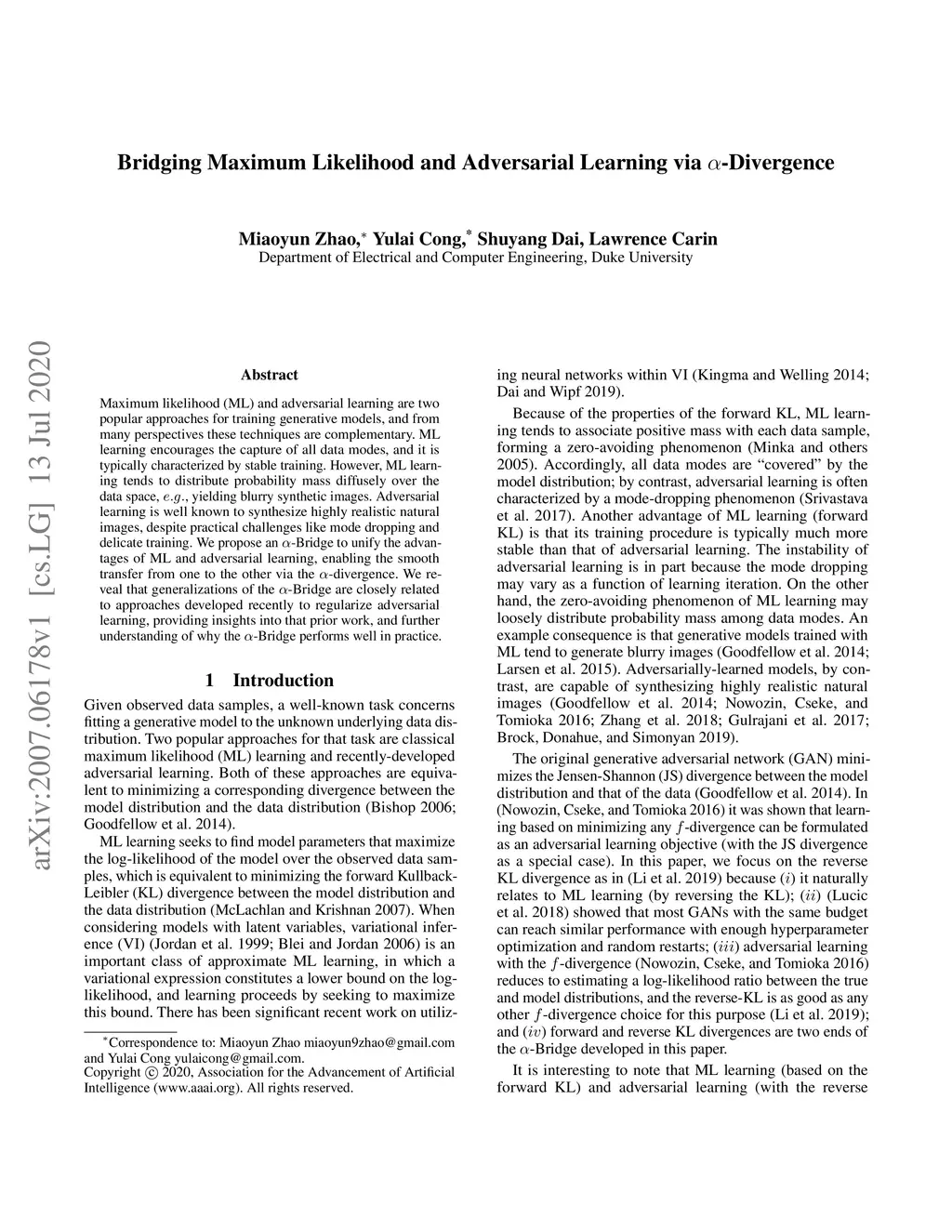 Maximum likelihood (ML) and adversarial learning are two popular approaches for training generative models, and from many perspectives these techniques are complementary. ML learning encourages the capture of all data modes, and it is typically characterized by stable training. However, ML learning tends to distribute probability mass diffusely over the data space, , yielding blurry synthetic images. Adversarial learning is well known to synthesize highly realistic natural images, despite practical challenges like mode dropping and delicate training. We propose an -Bridge to unify the advantages of ML and adversarial learning, enabling the smooth transfer from one to the other via the -divergence. We reveal that generalizations of the -Bridge are closely related to approaches developed recently to regularize adversarial learning, providing insights into that prior work, and further understanding of why the -Bridge performs well in practice.