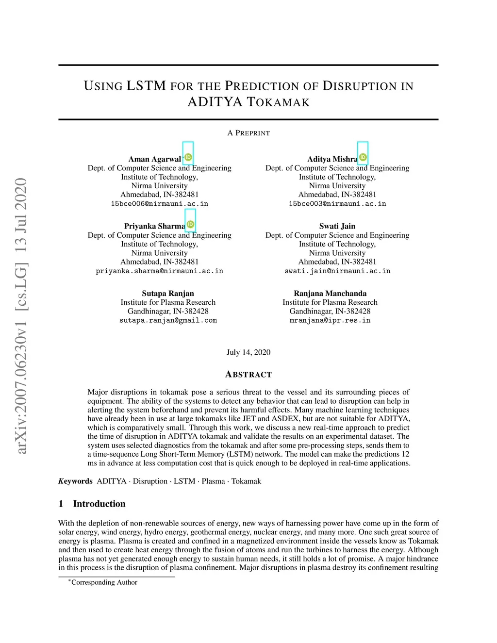 Using LSTM for the Prediction of Disruption in ADITYA Tokamak